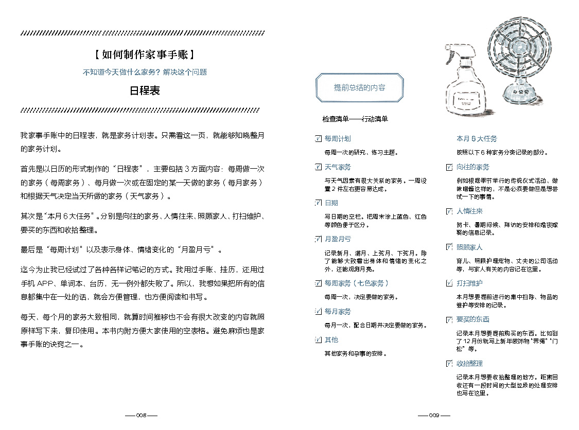 本書以手賬的形式分配管理各類家務(wù),擺脫生活中的“不確定因素”,讓“找東西”、“查資料”、“傷腦筋”的事情一掃而空,從而達(dá)到優(yōu)化家務(wù)流程,提升家務(wù)效率的效果。作者將家務(wù)分為“每日家務(wù)、每周家務(wù)、每月家務(wù)、季節(jié)家務(wù)、天氣家務(wù)、向往的家務(wù)、照顧家人、人情往來”八大類;手賬備忘錄又分為“我家的物品、我家的事情、我家的人、人情往來”四小類。每類家務(wù)都配有文字說明、萌趣插畫解讀和手賬示例,而且書后還附贈家務(wù)手賬模板,讀者可以復(fù)印使用,實(shí)用而方便。
