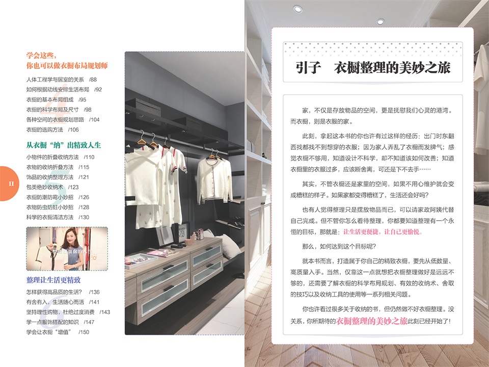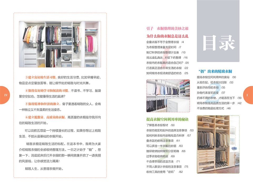 精致人生,從整理衣櫥開始。很多人不知道該怎樣整理自己的衣櫥,還有的人整理過后不久衣櫥又變得混亂了,這都是因為整理和收納的方法不對。整理衣櫥不是簡單的減少物品就可以達到目的,不但要做到丟以我為中心、不以物為中心的,更要反省自己的行為,選擇我們應該持有的物品,思考如何將生活整理得與眾不同,尋找適合自己的生活方式,過上自己真正想要的生活。