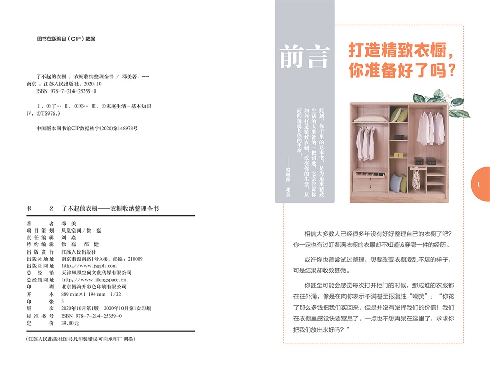在這本書中,整理師鄧美從選購衣櫥入手,到衣櫥的格局規(guī)劃、整理方法、清潔保養(yǎng)以及各類衣物的折疊、衣服的搭配、提升衣櫥品位等,全方位向讀者介紹關(guān)于衣櫥收納整理的內(nèi)容。全書分為六章:為什么你的衣櫥總是這么亂,“扔”出來的精致衣櫥,提高衣櫥空間利用率的奧秘,學會這些你也可以做衣櫥布局規(guī)劃師,從衣櫥“納”出精致人生態(tài)度,整理讓生活更精致。