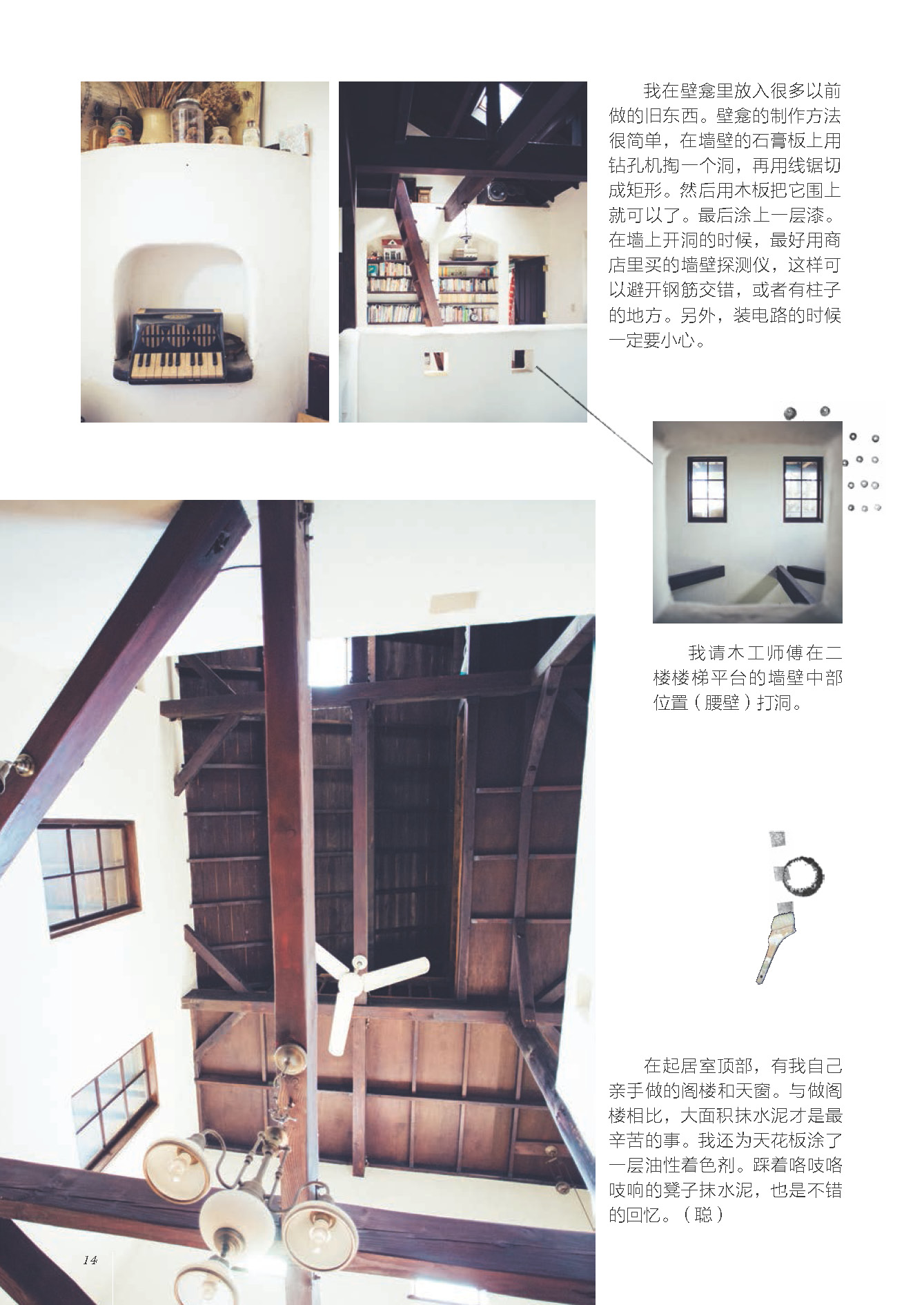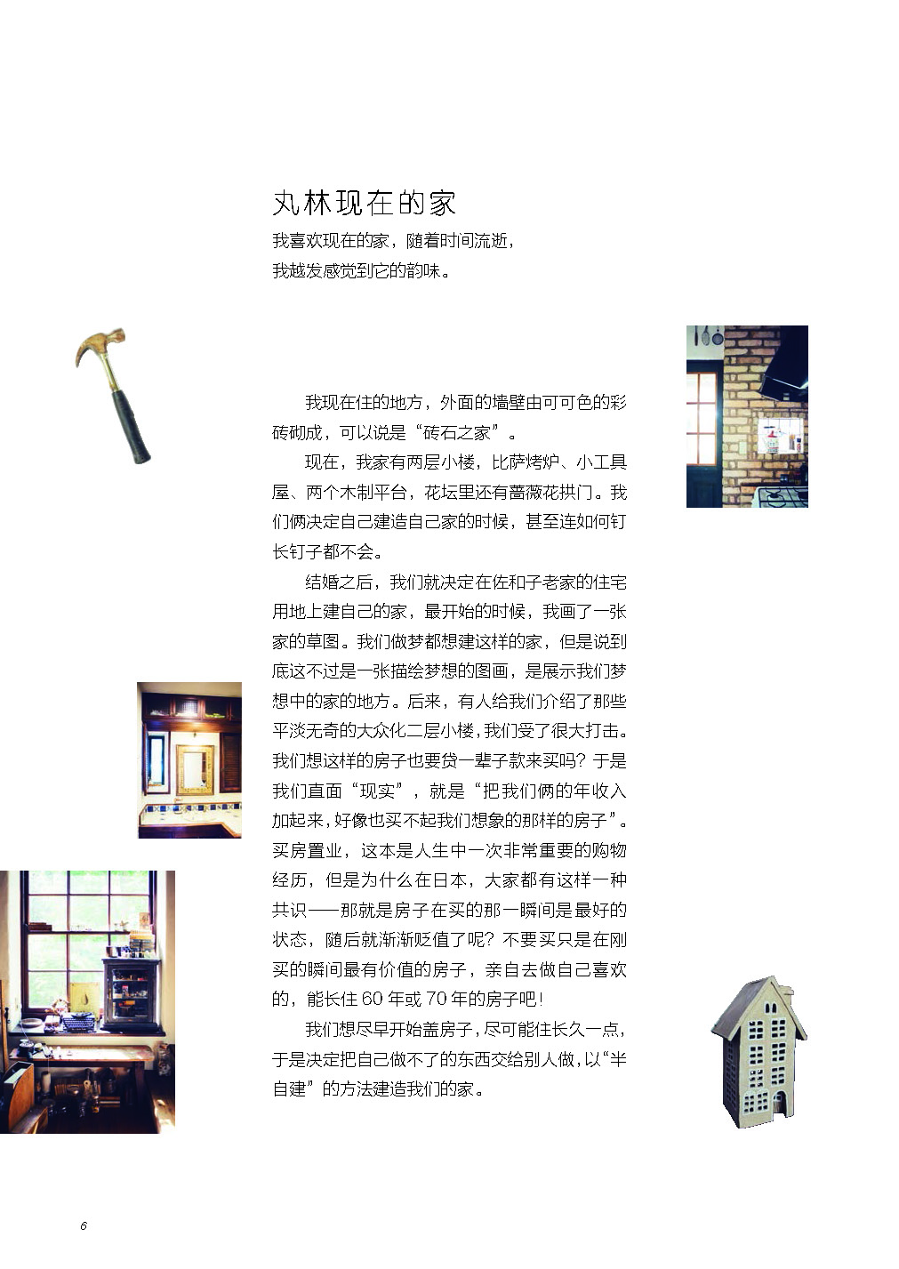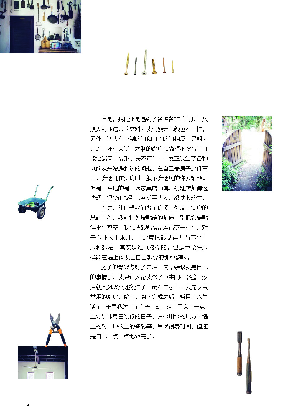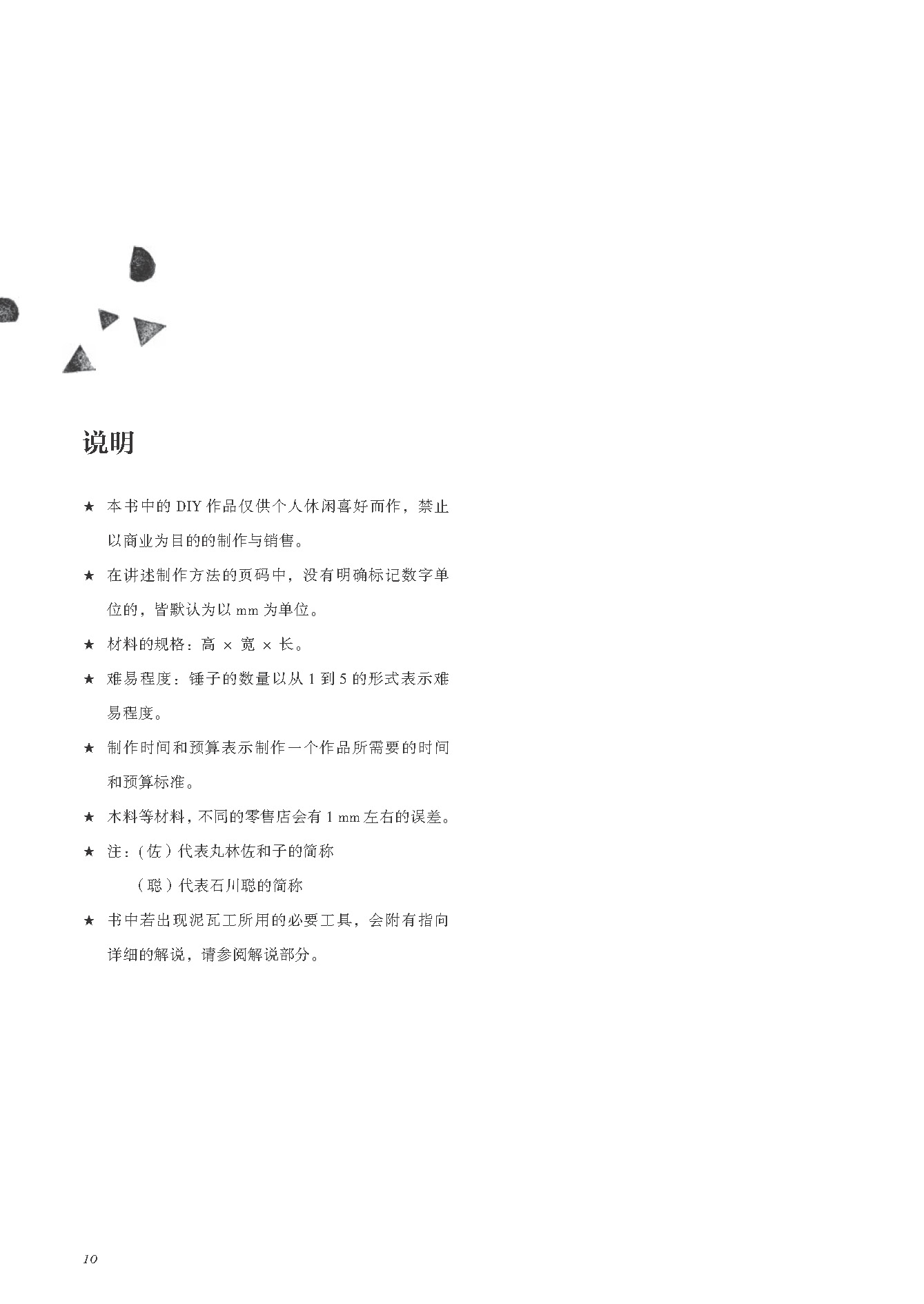 用木制托盤制作的圓凳、寬面隔斷、三層小花架、復(fù)古風(fēng)小水族箱、用紅酒盒改裝的儲(chǔ)物架等;第二章是貼上方形小瓷磚的調(diào)料架、桌上看書架、柔和的舊木材和皮革做成的托盤等;第三章是用裝飾線條做的小黑板、紙張收納架、紙帶收納架、收納空間充足的木閣樓等;第四章是大家都能蓋好的前廊、枕木和磚頭砌成的臺(tái)階、樸素的葡萄架、兩種銹鐵皮屋頂鳥窩等;第五章是木工基礎(chǔ)。書中實(shí)景圖、步驟圖詳細(xì),新手也能很快上手。