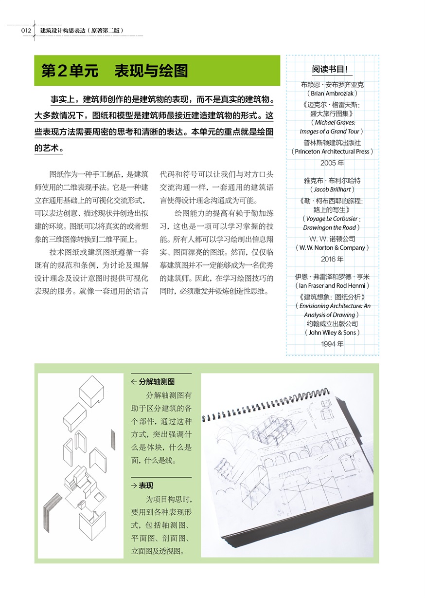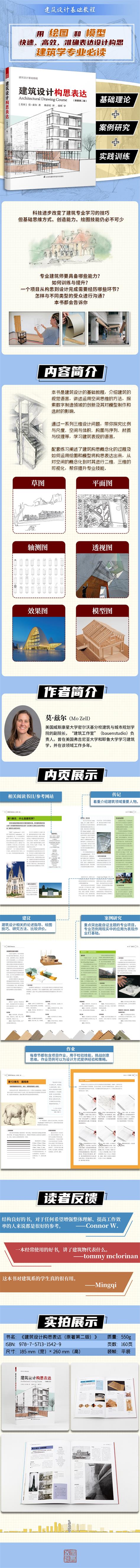 本書是建筑設(shè)計(jì)的基礎(chǔ)教程,強(qiáng)調(diào)建筑設(shè)計(jì)過程的創(chuàng)造性表現(xiàn),向讀者們介紹了建筑的視覺語言,講述了運(yùn)用空間思維的方法。本書通過一系列三維設(shè)計(jì)問題,讓讀者探究比例與尺度、空間與體積、構(gòu)圖與序列、材質(zhì)與紋理等各個(gè)方面,同時(shí)學(xué)習(xí)建筑表現(xiàn)的語言。此外,本書還提供了一系列配套練習(xí),闡述了建筑構(gòu)思概念化的過程,以及如何運(yùn)用繪圖和模型將這些構(gòu)思表達(dá)出來。
