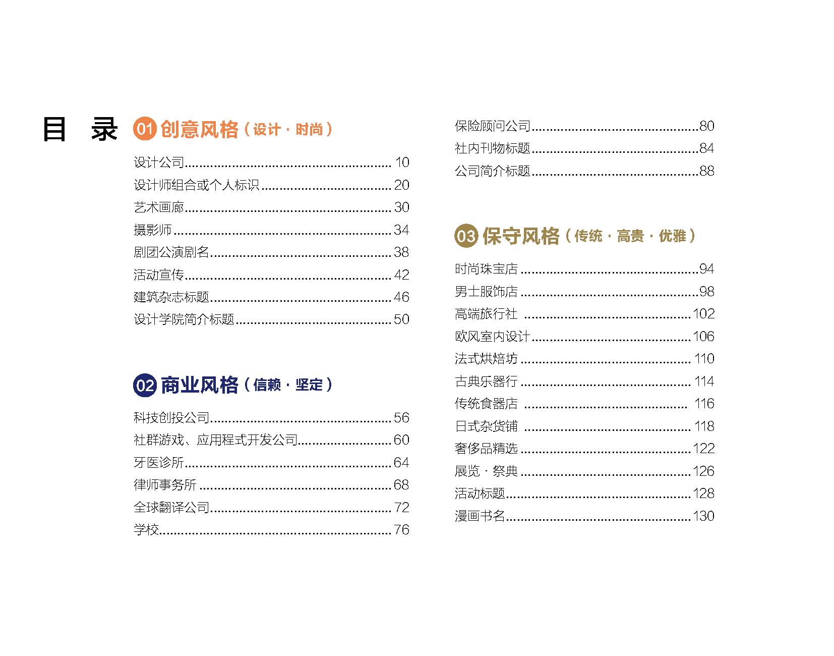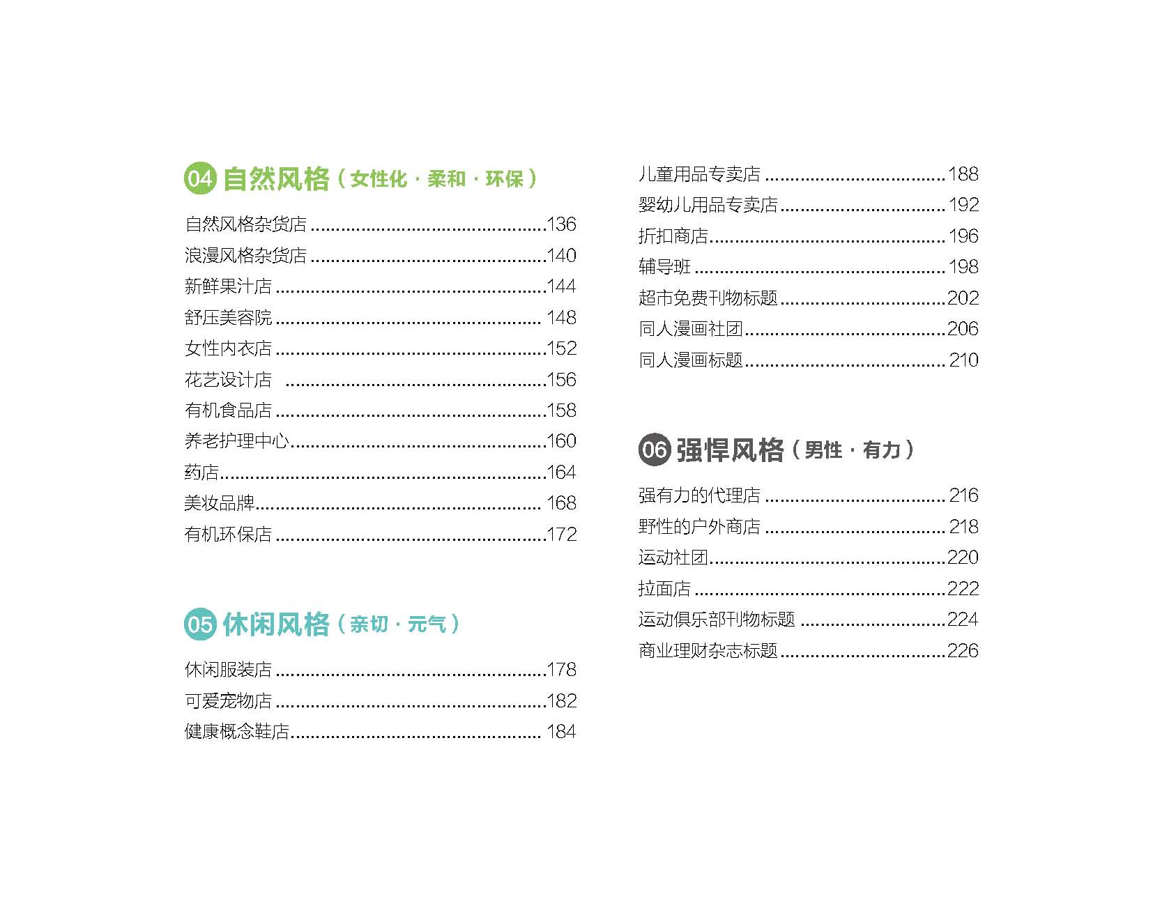 本書收集了五位日本專業(yè)設(shè)計師的創(chuàng)意結(jié)晶,完整收錄了超過1000 種LOGO 設(shè)計,分為創(chuàng)意風格、商業(yè)風格、保守風格、自然風格、休閑風格、強悍風格等六大類別,而各類別又可細分成56 個主題,包括“設(shè)計?時尚”“信賴?堅定”“傳統(tǒng)?高貴?優(yōu)雅”“女性化?柔和?環(huán)保”“親切?元氣”“男性?有力”等,讓你在遇到瓶頸時能透過清楚的分類方式,迅速查閱所需的信息。