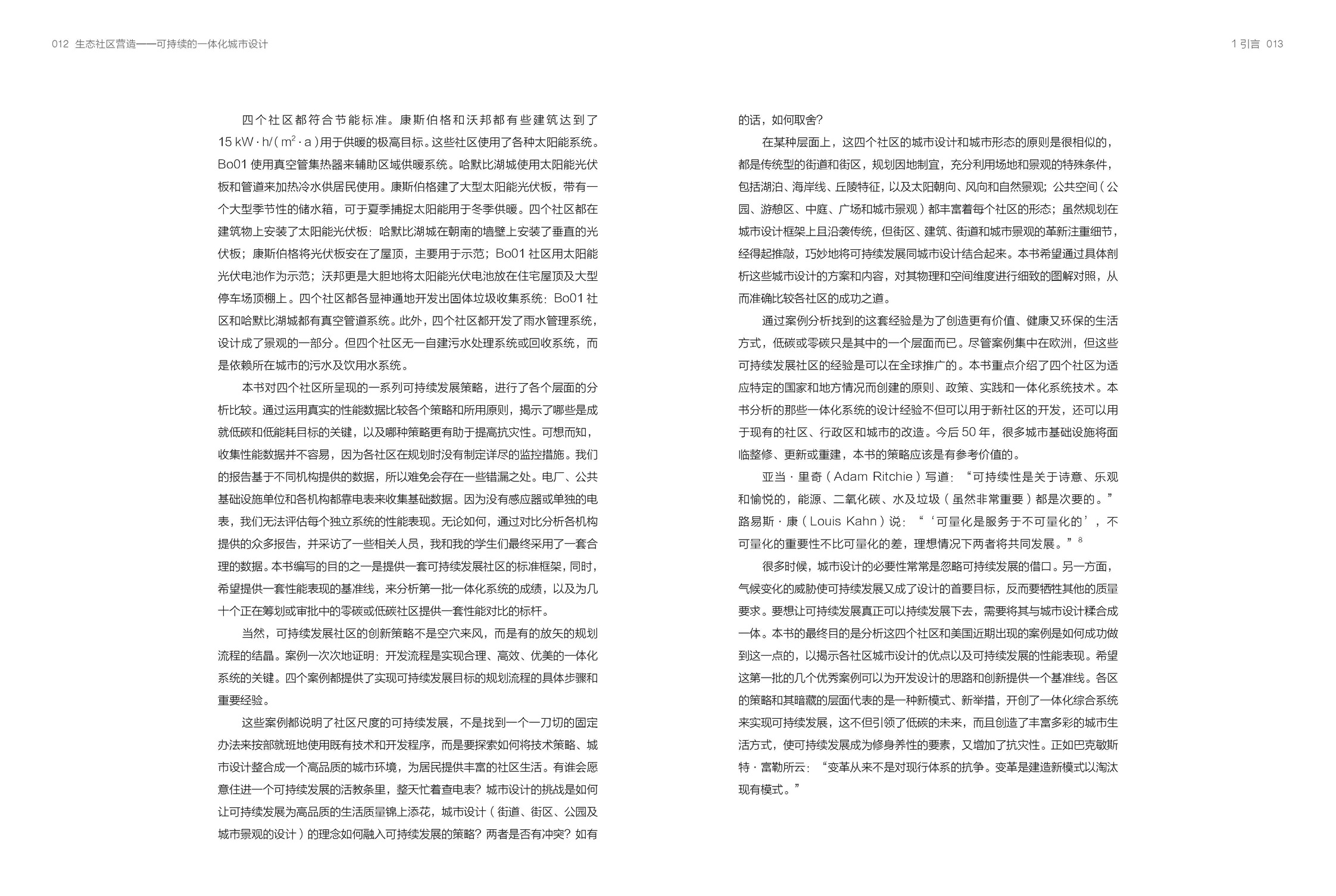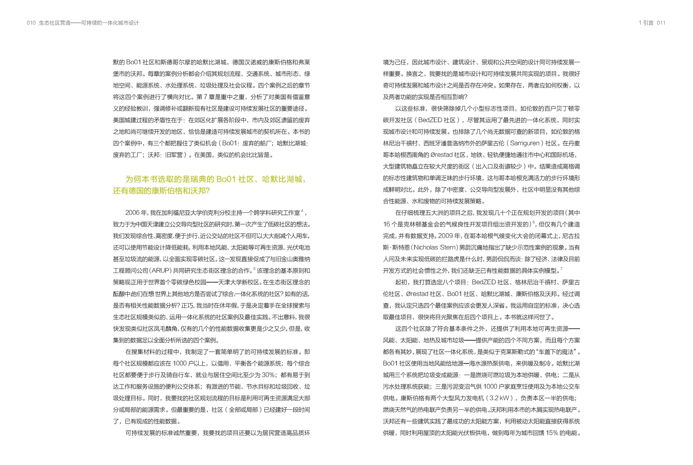 本書探討了第一批低碳社區(qū)的最佳實例,驗證了社區(qū)一體化系統(tǒng)的重要性,并指出了更區(qū)域化、更抗災(zāi)的基礎(chǔ)設(shè)施的方向,也表明“人作為一個參與環(huán)節(jié)”對實現(xiàn)規(guī)劃流程目標(biāo)的決定性作用。本書選取了四個實現(xiàn)可持續(xù)發(fā)展的經(jīng)典社區(qū):瑞典馬爾默的Bo01 社區(qū)和斯德哥爾摩的哈默比湖城,德國漢諾威的康斯伯格和弗萊堡市的沃邦。每章的案例分析都會介紹其規(guī)劃流程、交通系統(tǒng)、城市形態(tài)、綠地空間、能源系統(tǒng)、水處理系統(tǒng)、垃圾處理及社會議程。四個案例之后的章節(jié)將這四個案例進行了橫向?qū)Ρ?。? 章分析了對美國有借鑒意義的經(jīng)驗教訓(xùn),強調(diào)修補或翻新現(xiàn)有社區(qū)是建設(shè)可持續(xù)發(fā)展社區(qū)的重要途徑。美國城建過程的矛盾性在于:在郊區(qū)化擴展各階段中,市內(nèi)及郊區(qū)遺留的廢棄之地和尚可繼續(xù)開發(fā)的地區(qū),恰恰是建造可持續(xù)發(fā)展城市的契機所在。本書的四個案例中,有三個都把握住了類似機會(Bo01:廢棄的船廠;哈默比湖城:廢棄的工廠;沃邦:舊軍營)。這些實例和分析,對于我們現(xiàn)在的城市建設(shè),舊城更新和可持續(xù)社區(qū)的一體化設(shè)計十分具有參考價值。