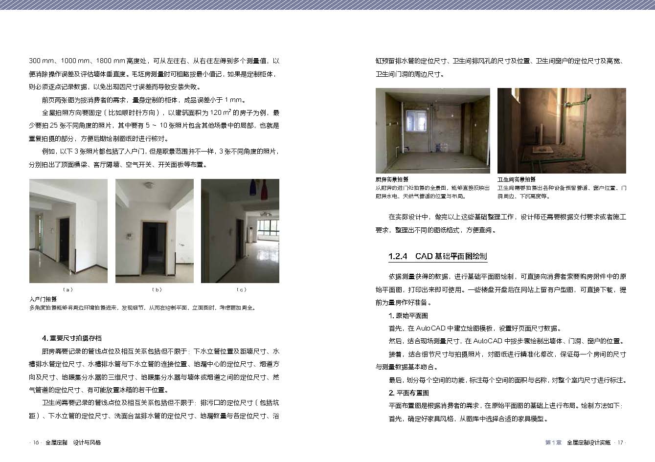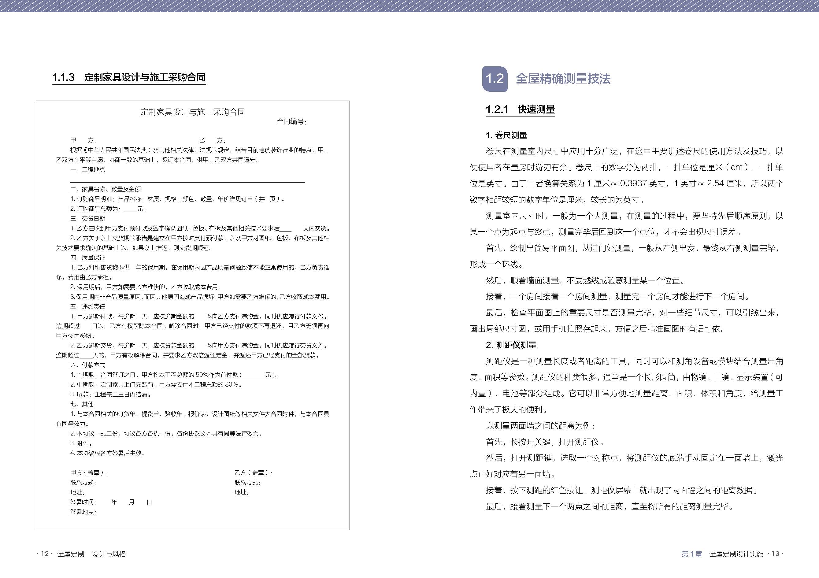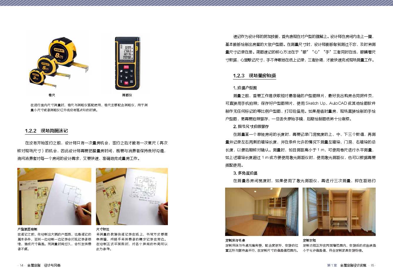 本書在編寫中從全屋訂制的設(shè)計流程、測量技法、質(zhì)量規(guī)范、設(shè)計風(fēng)格等方面進(jìn)行著手。硬裝方面介紹了集成吊頂、快裝墻板、地臺系統(tǒng)、成品房門、樓梯的等住宅空間硬裝定制的設(shè)計、安裝進(jìn)行詳細(xì)講解。軟裝方面介紹了家裝常用的十二種風(fēng)格的設(shè)計概念,有中式、日式、簡歐、現(xiàn)代、極簡、美式、歐式、后現(xiàn)代、地中海、東南亞、混搭、工業(yè)風(fēng)等,以案例的方式詳細(xì)分析了相關(guān)風(fēng)格的整裝家具是如何設(shè)計的。每種風(fēng)格分別以平面圖、頂面圖、鳥瞰效果圖、家具構(gòu)造圖等形式,詳細(xì)講解其定制的設(shè)計要點。