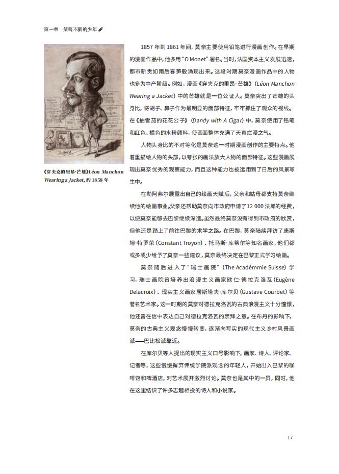 莫奈是世界著名的歐洲繪畫藝術(shù)大家、印象派代表人物及創(chuàng)始人之一,印象派的“印象”一詞即是源自其名作《印象?日出》。他擅長光與影的實驗與表現(xiàn)技法,創(chuàng)造性地在繪畫技法上改變了陰影和輪廓線的畫法,在其畫作中沒有非常明確的陰影,亦無突顯或平涂式的輪廓線,這也是印象派的主要表現(xiàn)技法之一。莫奈是如何從一個余業(yè)水平成為開宗立派的一代大師呢?本書時間為線索,從生活和繪畫兩個方向,生動、形象地還原了這位印象派大師莫奈的精彩人生。