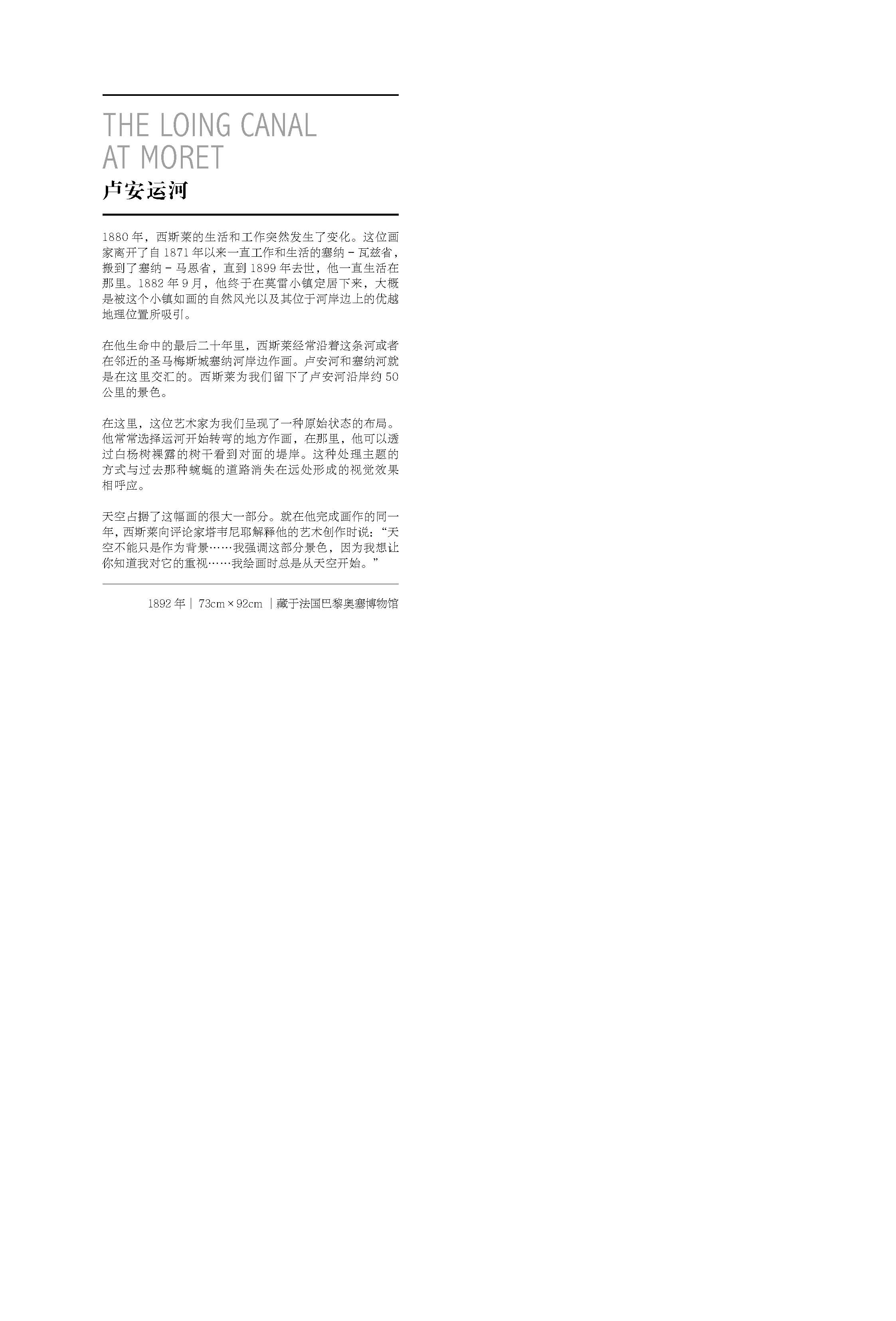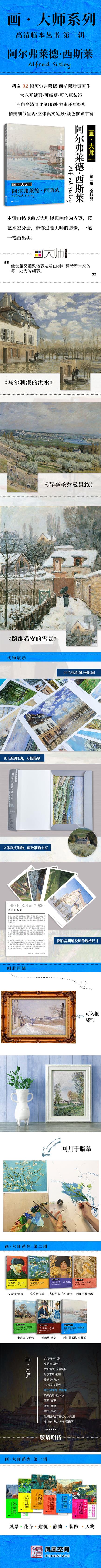 本冊藝術(shù)家為阿爾弗雷德?西斯萊,精選《馬爾利港的洪水》《路維希安的雪景》《在溪邊休憩》等32幅作品,為拉近讀者與大師的距離,本系列所挑選大師作品力求經(jīng)典。作品選擇內(nèi)容豐富、題材健康、色調(diào)明快、色塊清晰。從而達(dá)到受眾人群廣,從學(xué)生到美術(shù)愛好者,甚至美術(shù)培訓(xùn)機構(gòu),包括成人和兒童。裝幀形式更便于臨摹學(xué)習(xí)和室內(nèi)空間裝飾,用途廣泛。精美的封盒設(shè)計、考究的用紙以及高品質(zhì)、高清的印刷也為提升本系列畫帖的品質(zhì)的必要條件。