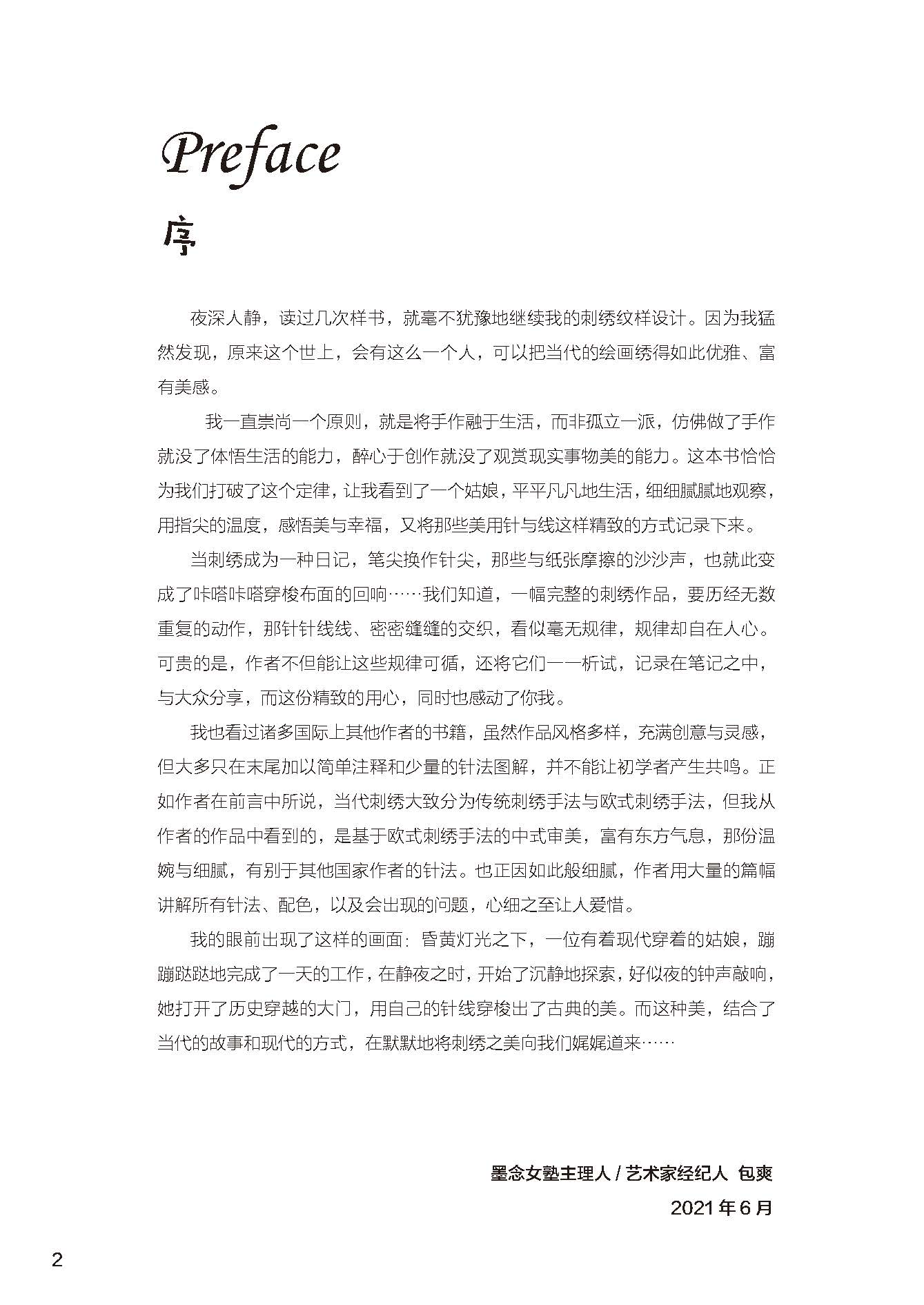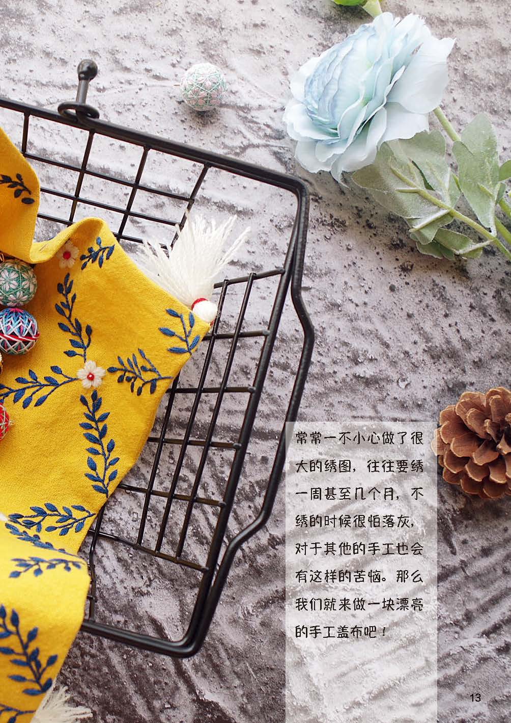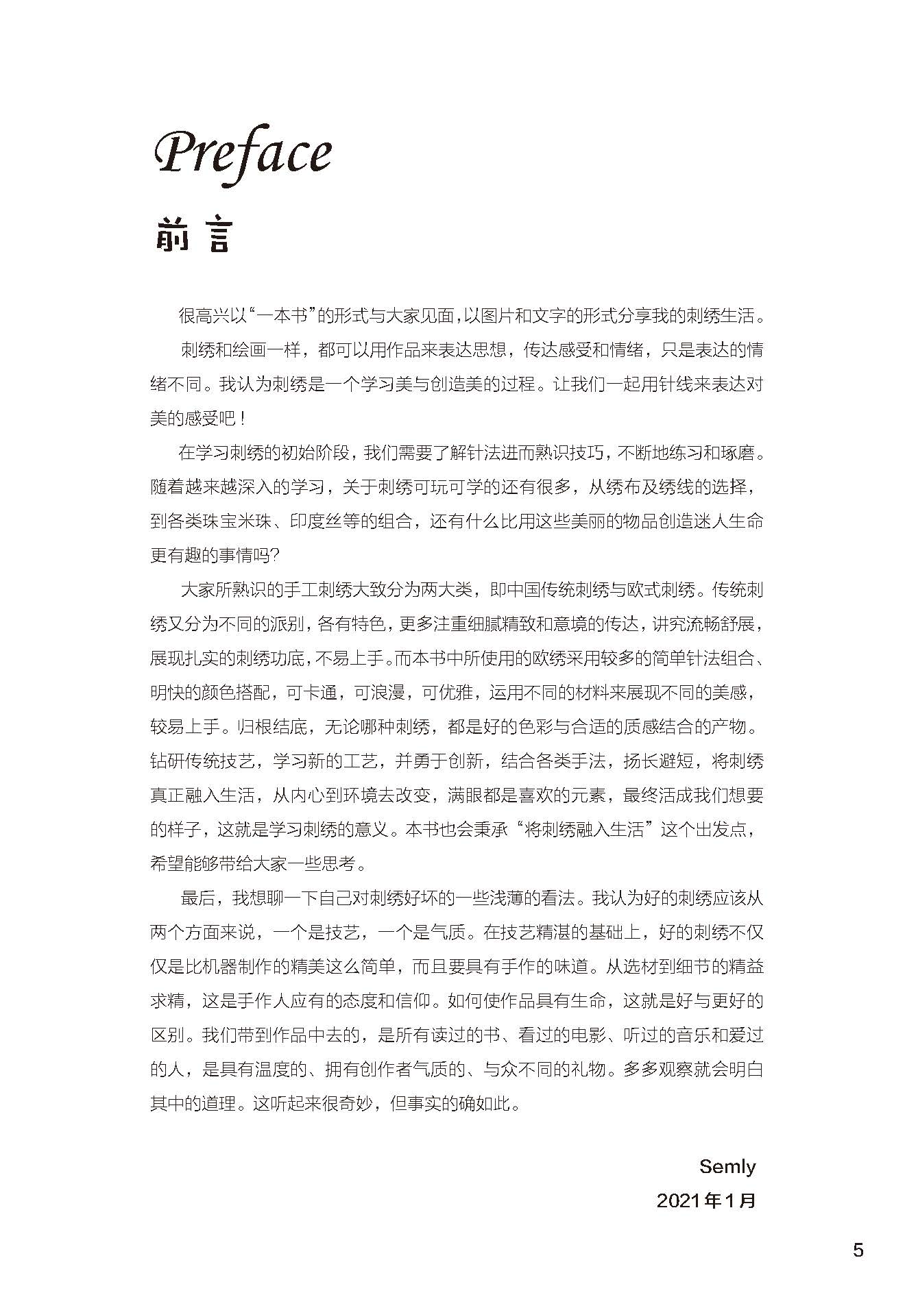 本書中所使用的歐繡采用較多的簡單針法組合、明快的顏色搭配,可卡通,可浪漫,可優(yōu)雅,運用不同的材料來展現(xiàn)不同的美感,較易上手。歸根結(jié)底,無論哪種刺繡,都是好的色彩與合適的質(zhì)感結(jié)合的產(chǎn)物。鉆研傳統(tǒng)技藝,學(xué)習(xí)新的工藝,并勇于創(chuàng)新,結(jié)合各類手法,揚長避短,將刺繡真正融入生活,從內(nèi)心到環(huán)境去改變,滿眼都是喜歡的元素,最終活成我們想要的樣子,這就是學(xué)習(xí)刺繡的意義。本書也會秉承“將刺繡融入生活”這個出發(fā)點,希望能夠帶給大家一些思考。