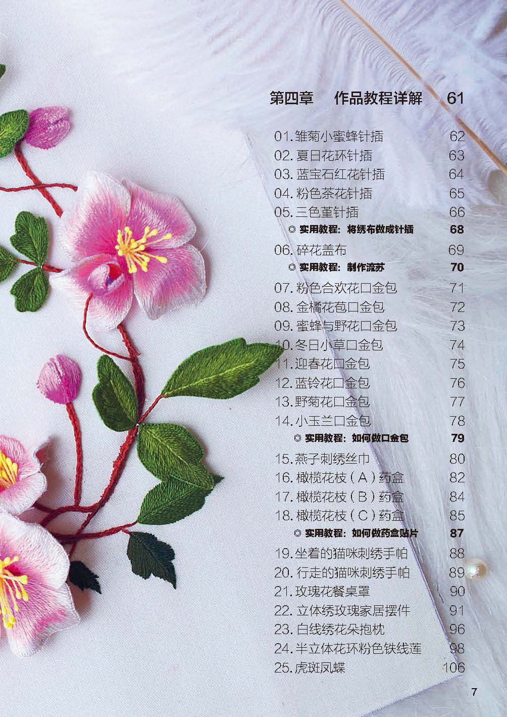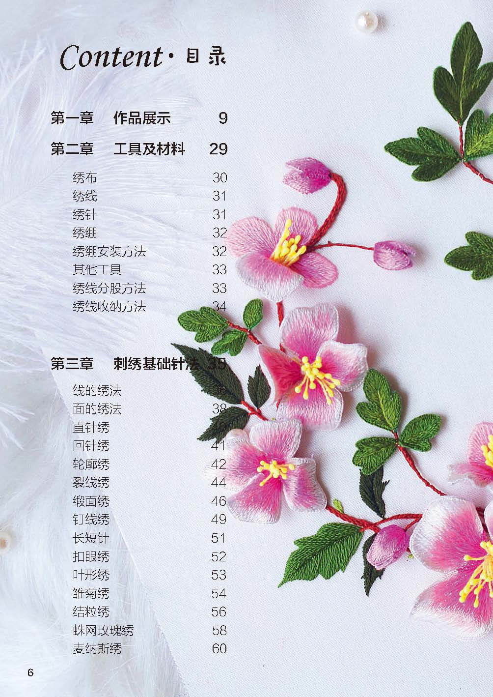 《刺繡入門 森系立體實用刺繡小物輕松做》本書一共分為四個章節(jié)的內(nèi)容,第一章刺繡成品展示,第二章 工具及材料 ,第三章 刺繡基礎(chǔ)針法,第四章 作品教程詳解。玫瑰花餐桌罩、 立體繡玫瑰家居擺件、 白線繡花朵抱枕、半立體花環(huán)粉色鐵線蓮、虎斑鳳蝶。刺繡和繪畫一樣,都可以用作品來表達思想,傳達感受和情緒,只是表達的情緒不同。刺繡是一個學(xué)習(xí)美與創(chuàng)造美的過程。讓我們一起用針線來表達對美的感受吧 !在技藝精湛的基礎(chǔ)上,好的刺繡不僅僅是比機器制作的精美這么簡單,而且要具有手作的味道。從選材到細(xì)節(jié)的精益求精,這是手作人應(yīng)有的態(tài)度和信仰。如何使作品具有生命,這就是好與更好的區(qū)別。我們帶到作品中去的,是所有讀過的書、看過的電影、聽過的音樂和愛過的人,是具有溫度的、擁有創(chuàng)作者氣質(zhì)的、與眾不同的禮物。多多觀察就會明白其中的道理。這聽起來很奇妙,但事實的確如此。