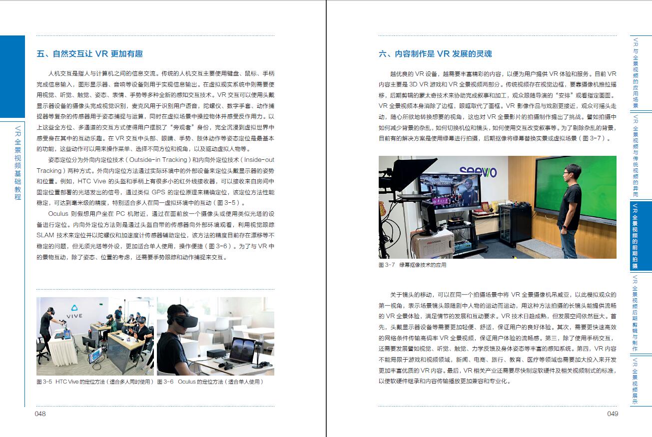 本書(shū)從VR與全景視頻的應(yīng)用場(chǎng)景開(kāi)始,深入淺出地分析了VR技術(shù)新聞行業(yè)、文化教育行業(yè)及影視片創(chuàng)作的影響,深入總結(jié)了VR全景視頻與傳統(tǒng)視頻的異同,詳細(xì)講述了VR全景視頻的前期拍攝、后期制作與視頻展示的步驟與技巧,并甄選出教學(xué)實(shí)踐中的精品案例,依托于師生熟悉的高校校園環(huán)境進(jìn)行呈現(xiàn),讓讀者在了解和感受VR技術(shù)的同時(shí),逐漸掌握VR視頻制作的基礎(chǔ)知識(shí)和實(shí)際操作能力。內(nèi)容簡(jiǎn)明易懂,圖文并茂,適合高校相關(guān)專(zhuān)業(yè)學(xué)生、VR愛(ài)好者閱讀。