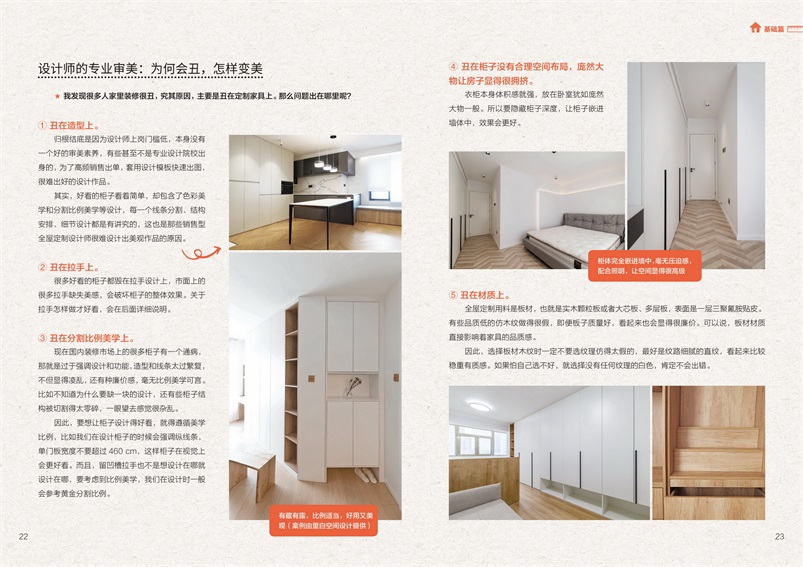 本書分為三部分,分別為基礎篇、攻略篇和案例篇?;A篇共7章,著重講解全屋定制的準備階段,即全屋定制需要規(guī)避哪些坑、做好哪些工作,以及設計的要點等;攻略篇有5章,從臥室、客廳、廚房、書房等空間入手,分別講解全屋定制中的各種空間應如何規(guī)劃,以及與其他空間怎樣協(xié)調統(tǒng)一,共同完成全屋定制的裝修,實現(xiàn)全屋風格一致;案例篇精選了9個案例,針對不同戶型或者一些特殊情況,解析全屋定制如何設計,以及可以借鑒的奇思妙想等。全書圍繞全屋定制,從準備工作開始,到具體的設計與裝修,再到案例解析,可謂是一本非常實用的全屋定制設計裝修攻略手冊。