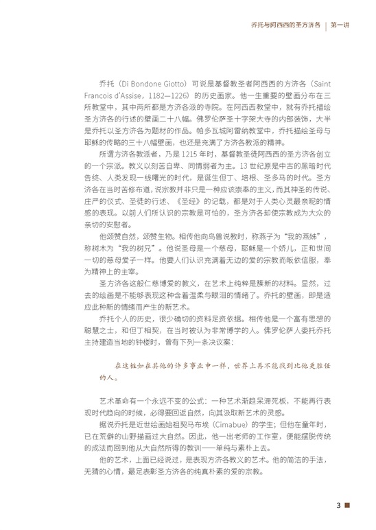 全書圍繞文藝復興以來西方近二十位藝術(shù)大師及其名作展開討論,著重介紹了文藝復興初期自喬托以來,經(jīng)過全盛期“三杰”(達芬奇、米開朗琪羅、拉斐爾),十七世紀的倫勃朗、魯本斯,到十八、十九世紀的近二十位畫壇巨匠及其名作。講解其藝術(shù)風格、繪畫技巧,又輔以大師生平、時代思潮等內(nèi)容,從藝術(shù)風格延至人格操守,行文生動洗練,深入淺出,融文學、音樂、哲學、社會、時代于一體,授人以美慧而無虛浮之心。