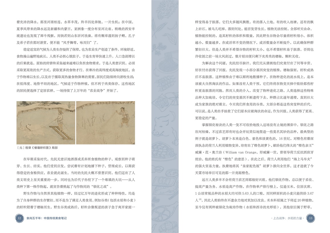 本書用歷史故事串聯(lián)起中國的代表性食物、食材,以及烹飪技術(shù)的源流、演變和歷史影響。全書共十四章,分別為:稻花香里說萬年(水稻馴化、稻作發(fā)展簡史和中國米飯文化)、面條的征途(面條的出現(xiàn)、演變和分化以及吃面的典故等)、燒烤恩仇錄(歷朝歷代燒烤的普及情況及各時(shí)期經(jīng)典燒烤菜式)、從刺客到長江三鮮(歷史上中國人餐桌上主要魚類的嬗變以及不同時(shí)期的烹魚之法)、豬羊爭霸(中原畜牧業(yè)發(fā)展、歷朝歷代對肉類的不同偏好,以及豬肉、羊肉“地位”的反復(fù)爭奪等)、唐宋用餐指南(介紹上古用餐家具和在今天看起來略顯“奇葩”的用餐禮儀等)、千古風(fēng)流炒菜(唐宋能源危機(jī)、鐵鍋普及和宋代炒菜崛起)、奸相的享受(兩宋廚娘,以及蔡京所嗜食物鲊)、麻辣明清(前辣椒時(shí)代中國人常使用的辛辣食材,以及辣椒的引入和傳播)、千里來龍《隨園食單》(《隨園食單》里的一些菜譜)、糕點(diǎn)之脈(傳統(tǒng)糕點(diǎn)的前世今生)、甜味王朝(古人的糖果、甜品、冰淇淋等)。