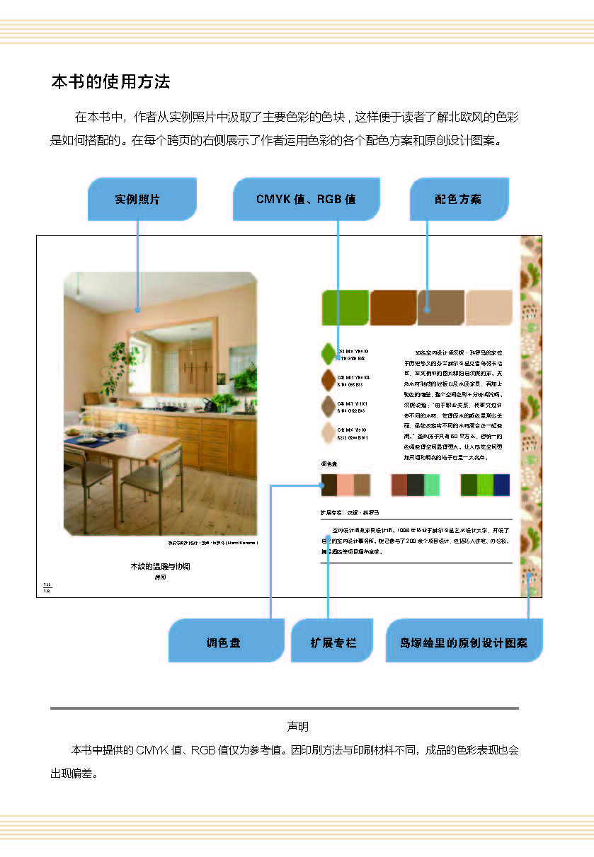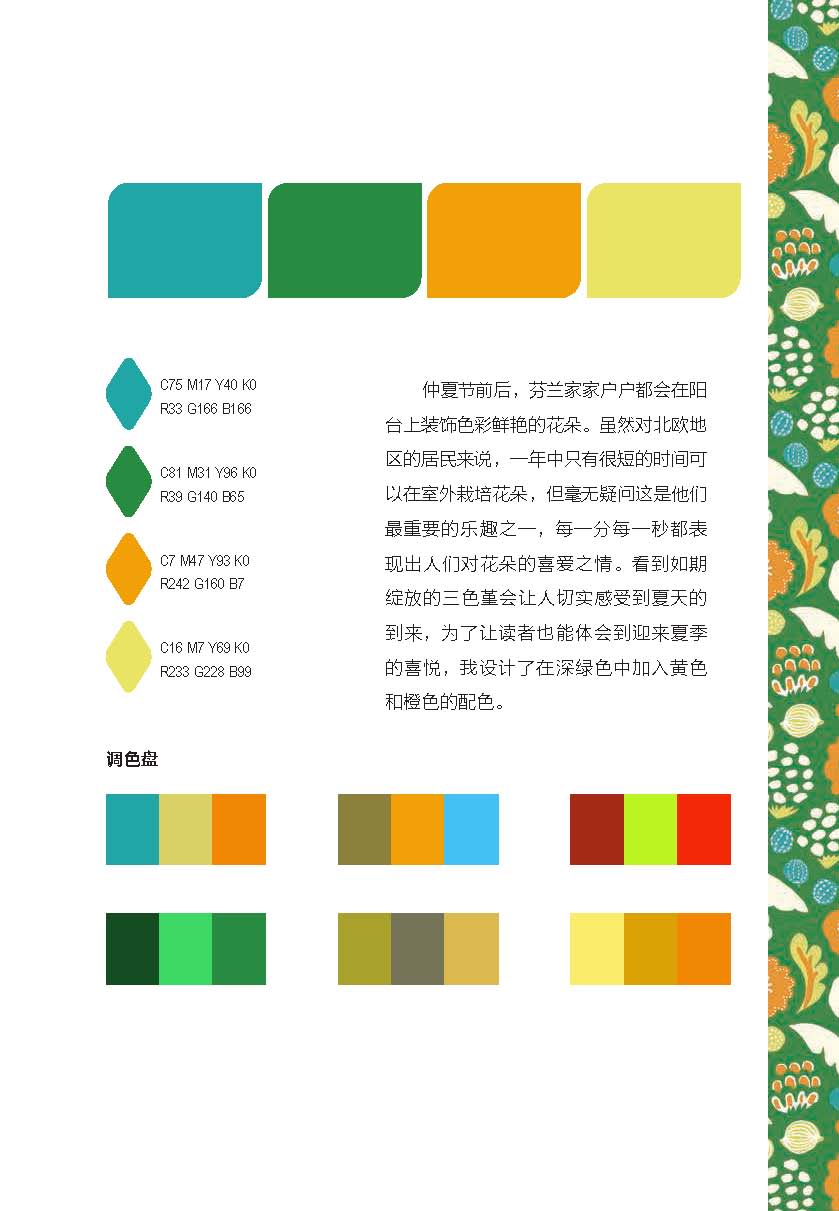 在本書中,作者從實例照片中汲取了主要色彩的色塊, 這樣便于讀者了解北歐風的色彩是如何搭配的。在每個跨頁的右側(cè)展示了作者運用色彩的各個配色方案和原創(chuàng)設(shè)計圖案。