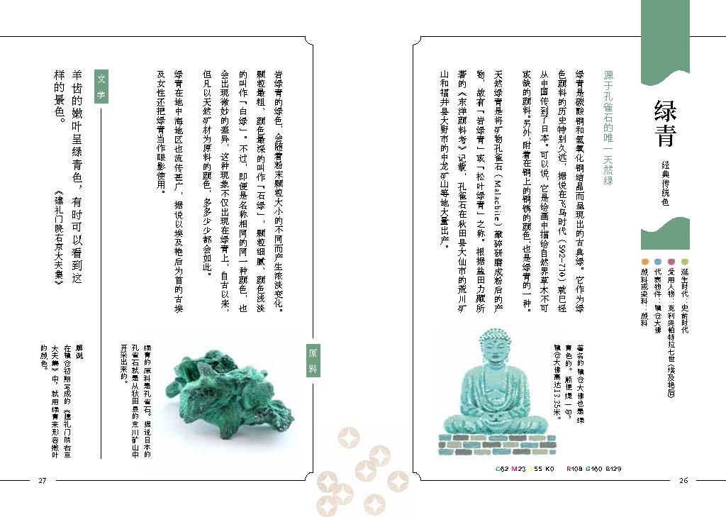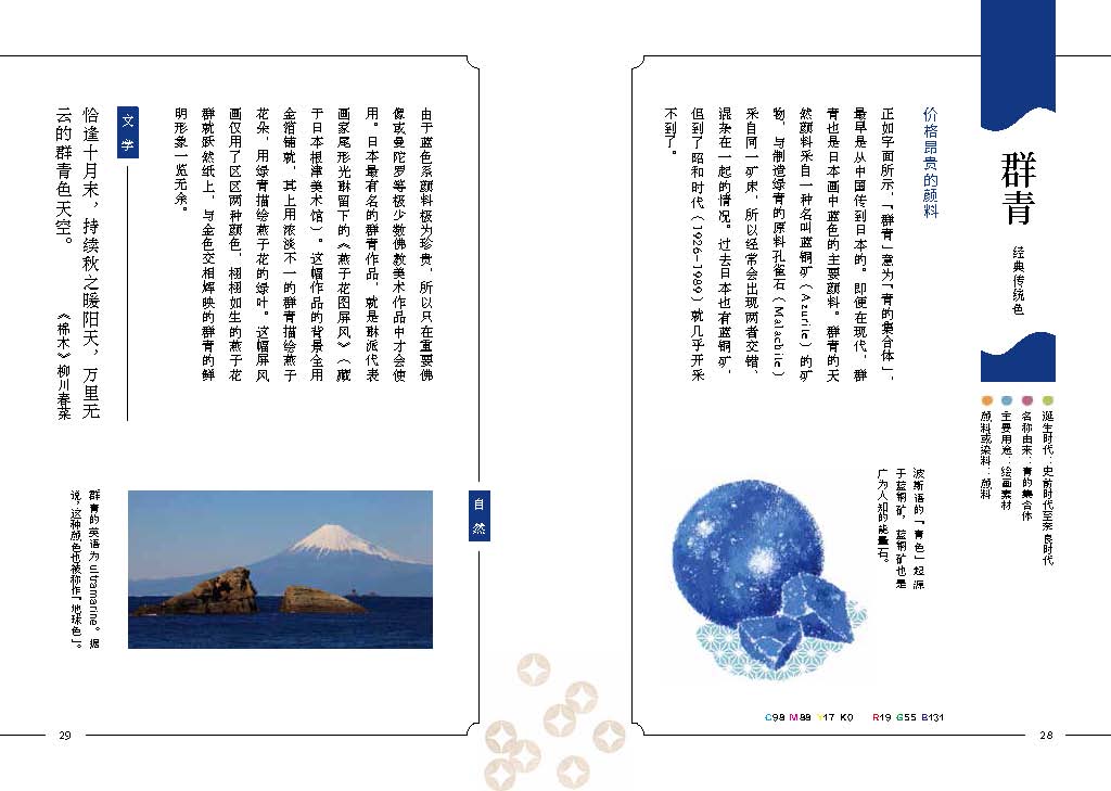 在通過(guò)化學(xué)合成來(lái)生成色彩的今天,人們或許很難理解色彩本身被賦予的意義。 但是,只要我們洞悉了色彩的來(lái)源和先人的感性,或許就會(huì)發(fā)現(xiàn):原來(lái)我們身邊的色彩都是在大自然中孕育而生的,而我們也生活在無(wú)需日歷和時(shí)鐘的大自然之中……”