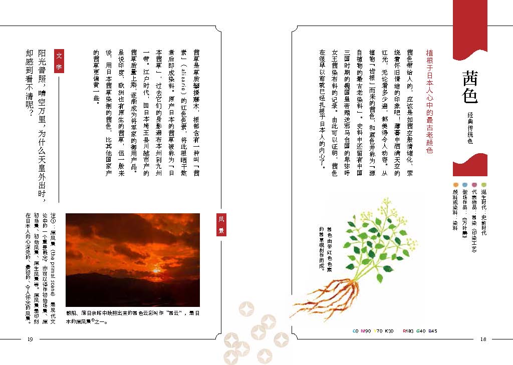 本書(shū)將紛繁的日本傳統(tǒng)色分類(lèi)呈現(xiàn),用語(yǔ)言描繪色彩,使色彩回到具體事物中,回到自然萬(wàn)物、衣食住行,回到植物色、礦物色的著色工藝中。另一方面也讓色彩成為一種獨(dú)立的審美對(duì)象,具有獨(dú)立的美學(xué)意義。