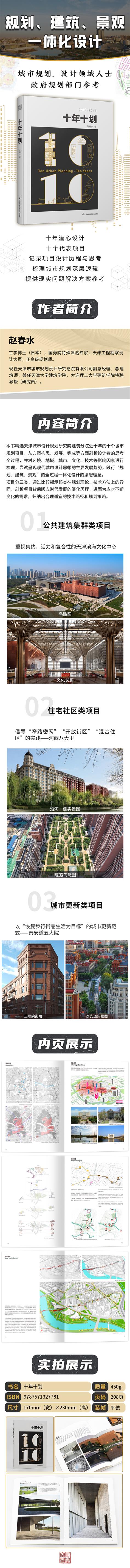 《十年十劃》精選天津城市設計規(guī)劃研究院建筑分院十年來的十個城市規(guī)劃項目,如天津文化中心、濱海文化中心、天津第一熱電廠、河西八大里、泰安道五大院,義烏異國風情街、西開教堂等城市設計實踐。
