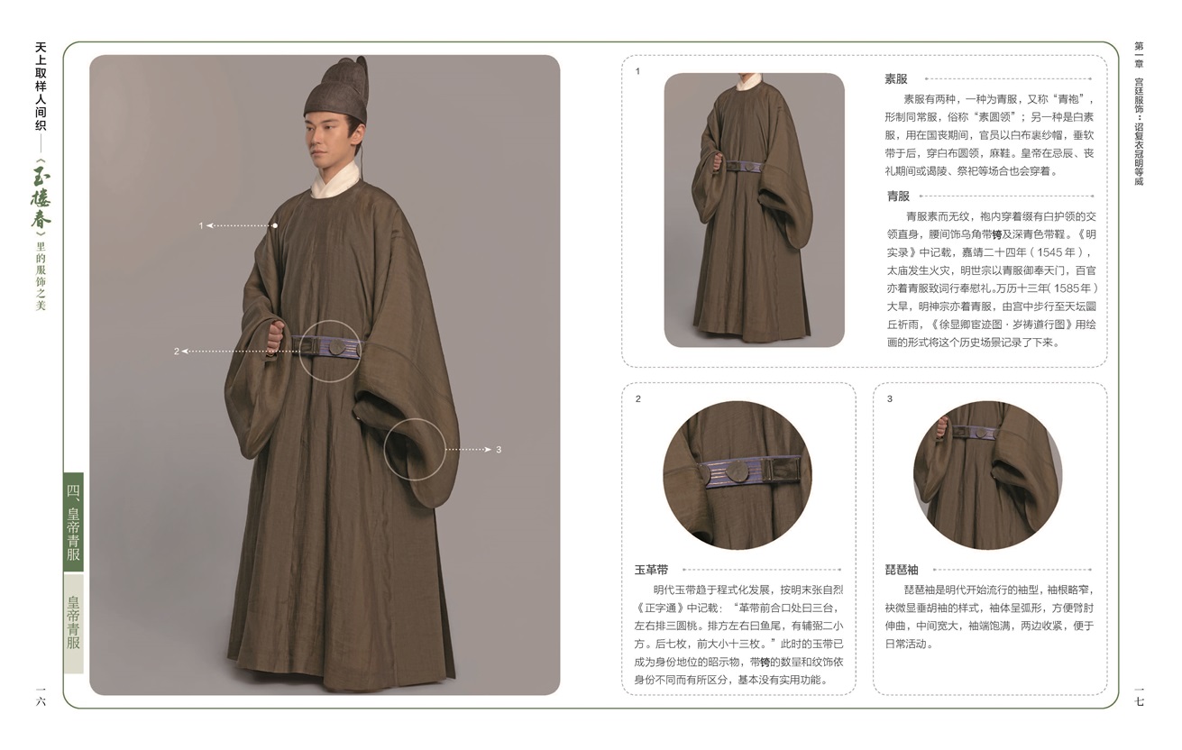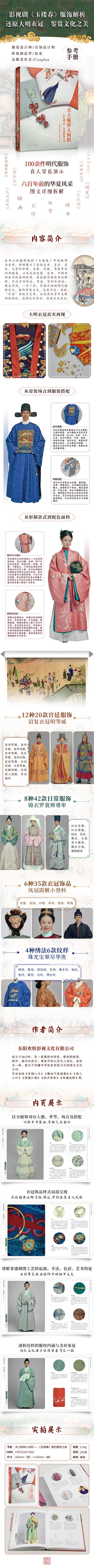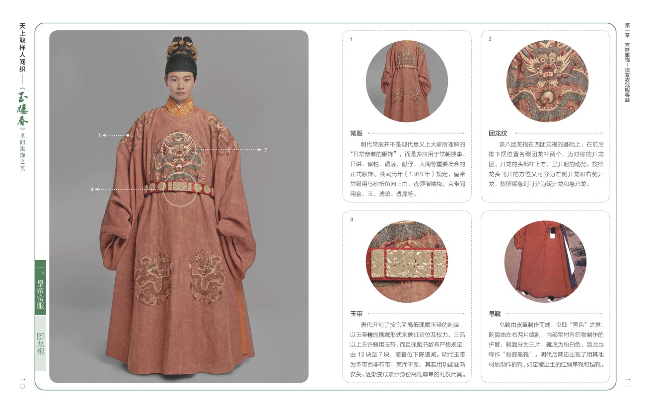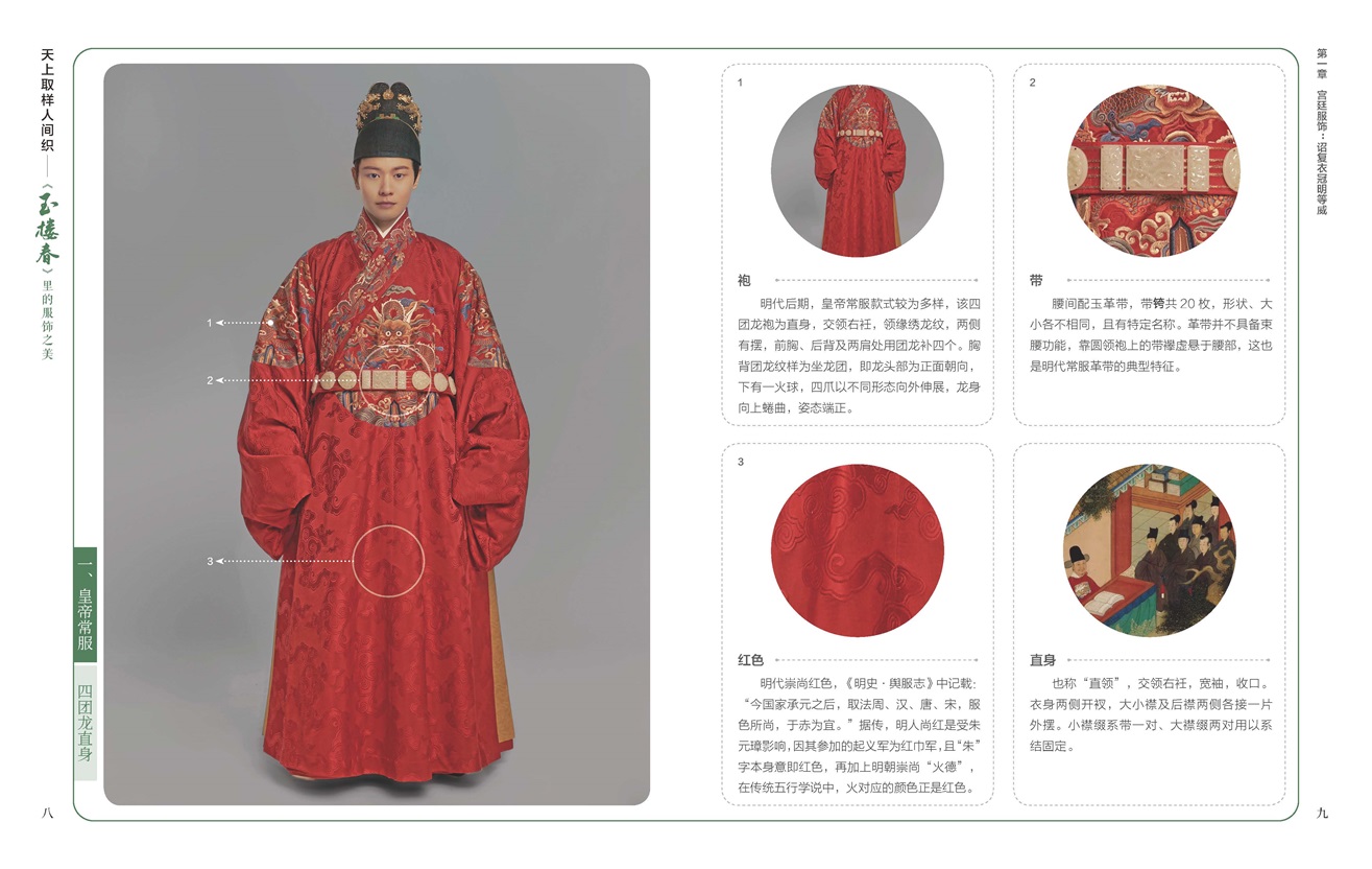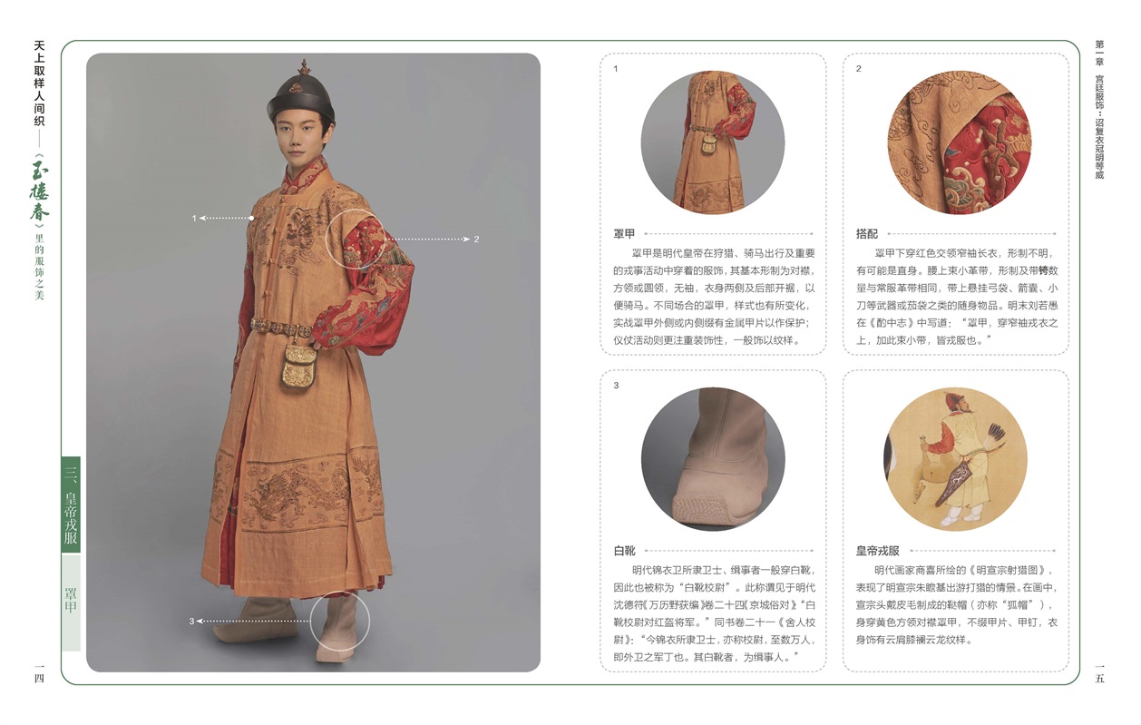 《天上取樣人間織——<玉樓春>里的服飾之美》主要以熱播影視劇《玉樓春》中的服飾為素材,梳理展示了包括劇中的近70種服裝,以及各種不同款式的衣冠、飾品等。書中圖片選取的定妝照服飾,包括皇帝常服、皇后禮服、士庶男子服飾、婦女便服、軍戎服飾等,配以易讀而不失專業(yè)的文字,詳細(xì)解釋不同服飾背后蘊(yùn)含的文化。作者團(tuán)隊(duì)用簡明易懂的語言,穿插我國古代服飾的基本知識,將多種服飾的特色和典故娓娓道來,同時(shí)介紹了刺繡、緙絲等“非遺”傳統(tǒng)手藝。書中選取圖片精美,文字優(yōu)美,抒發(fā)了作者團(tuán)隊(duì)對中國服飾文化的禮贊。