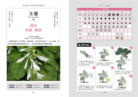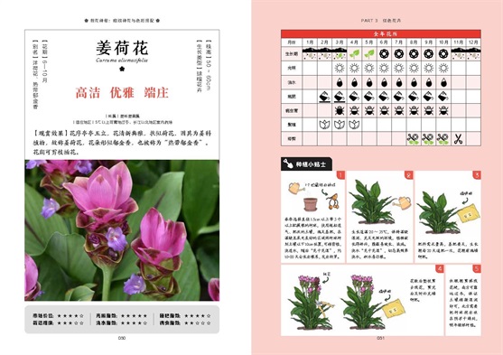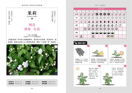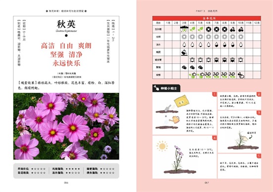 養(yǎng)花的過程累并快樂著,書中的手繪養(yǎng)護步驟觀感輕松,全年花歷一目了然,配色小貼士溫暖貼心,光、溫、水、土、肥、病蟲害防治等知識點,統(tǒng)統(tǒng)有述。無論你遇到什么養(yǎng)花疑惑,身處在南方,還是北方,都能找到適合自己院子種植的美麗花卉。