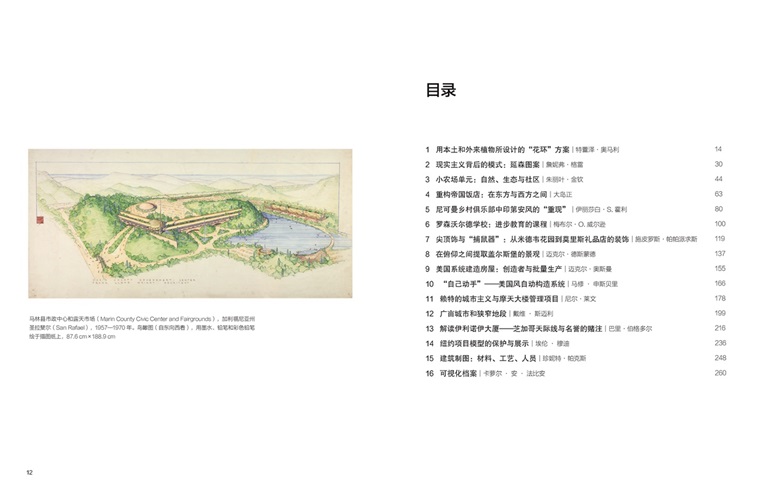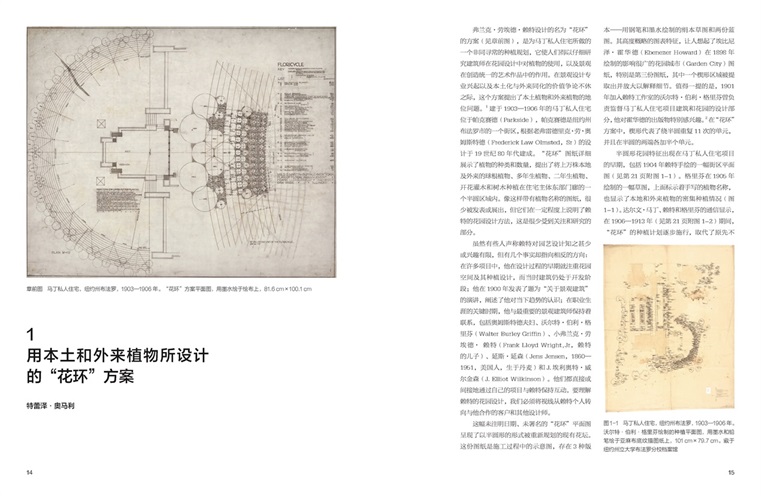 本書共有五個(gè)專題,從“自然”“文化”“建造”“城市規(guī)劃”以及“賴特檔案”五個(gè)方面對賴特的建筑理念、建造方式以及民主理想進(jìn)行解讀,涉及眾多賴特的知名項(xiàng)目,包括流水別墅、古根海姆博物館;以及未建成的規(guī)劃,如小農(nóng)市場、廣畝城市等。許多圖紙還是初次公開,具有很高的學(xué)術(shù)價(jià)值。