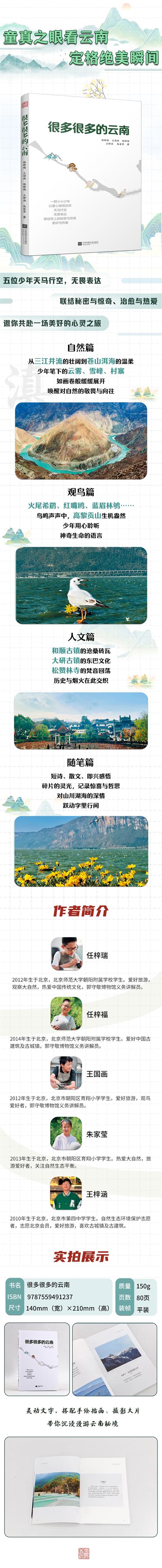 《很多很多的云南》是一本充滿愛心、童心和旅游樂趣的作品。五位少年將他們?cè)谠颇涎袑W(xué)的所思所想所感形成文字,表達(dá)出對(duì)生活和自然地?zé)釔?。全書分為自然風(fēng)光、觀鳥、人文、隨筆四大部分。自然風(fēng)光主要包括對(duì)云南自然環(huán)境的描述,觀鳥主要是對(duì)云南各種各樣鳥類的描寫和敘述,人文主要是云南古城、古鎮(zhèn)的旅游筆記,隨筆是小作者們對(duì)云南行程的感受隨筆。全書文字清新自然,童趣盎然,充滿了對(duì)大自然探索的樂趣和好奇心,讓讀者為之感慨贊嘆。