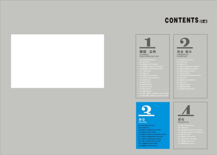 本套叢書按照建筑功能進行了分類,分別有公共規(guī)劃、商業(yè)展示、辦公和居住四個部分。在每本書中,又設置了更具體的歸類,集中展示了最新的建筑設計表現(xiàn)成果。