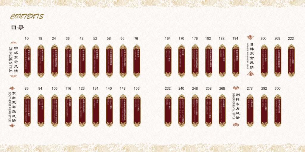 1.將東方風(fēng)情分成四種類別:中式東方風(fēng)情、東南亞海島風(fēng)情、日韓東方風(fēng)情、別樣?xùn)|方風(fēng)情