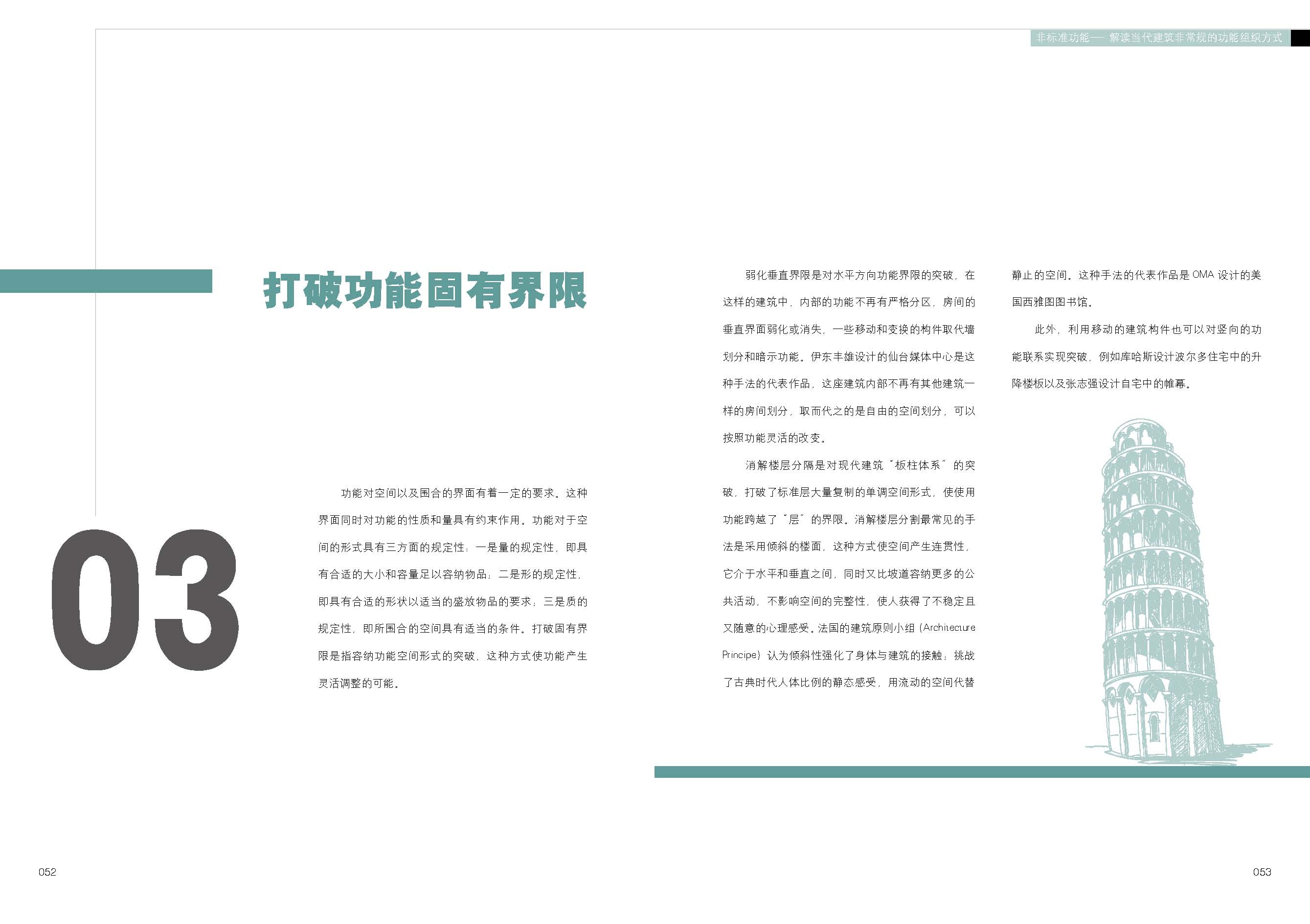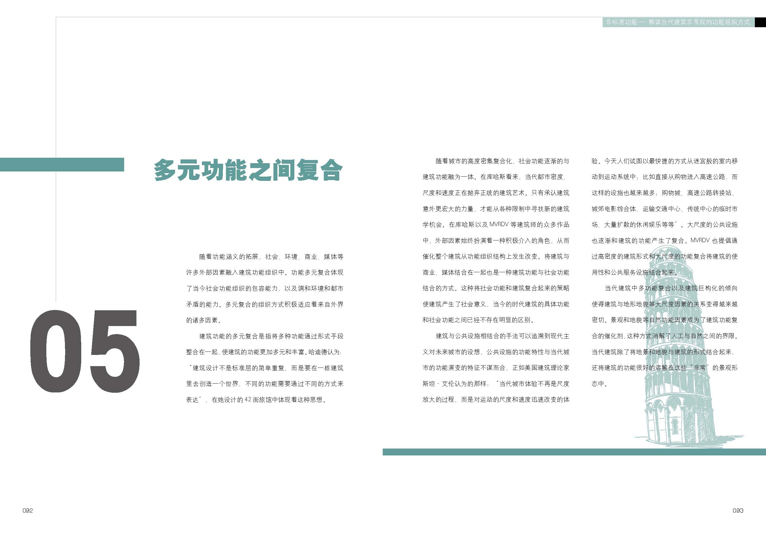 本書以功能組織相關(guān)領(lǐng)域的研究為基礎(chǔ),通過對當(dāng)代功能組織方式創(chuàng)新的案例進(jìn)行分析,用對比的方法揭示了這些功能組織方式的“非常規(guī)”的特征,歸納和提煉出非常規(guī)功能組織的一些基本手段,它們分別是:調(diào)整功能的空間格局、異化功能的流線模式、打破功能的固有界限、重構(gòu)功能的層級關(guān)系以及強(qiáng)調(diào)功能的多元復(fù)合。本文進(jìn)一步提出了這些非常規(guī)功能組織方式的適用領(lǐng)域以及現(xiàn)實(shí)意義,為我們審視當(dāng)今建筑創(chuàng)作的創(chuàng)新機(jī)制和預(yù)測未來建筑功能組織的發(fā)展趨勢做了鋪墊。