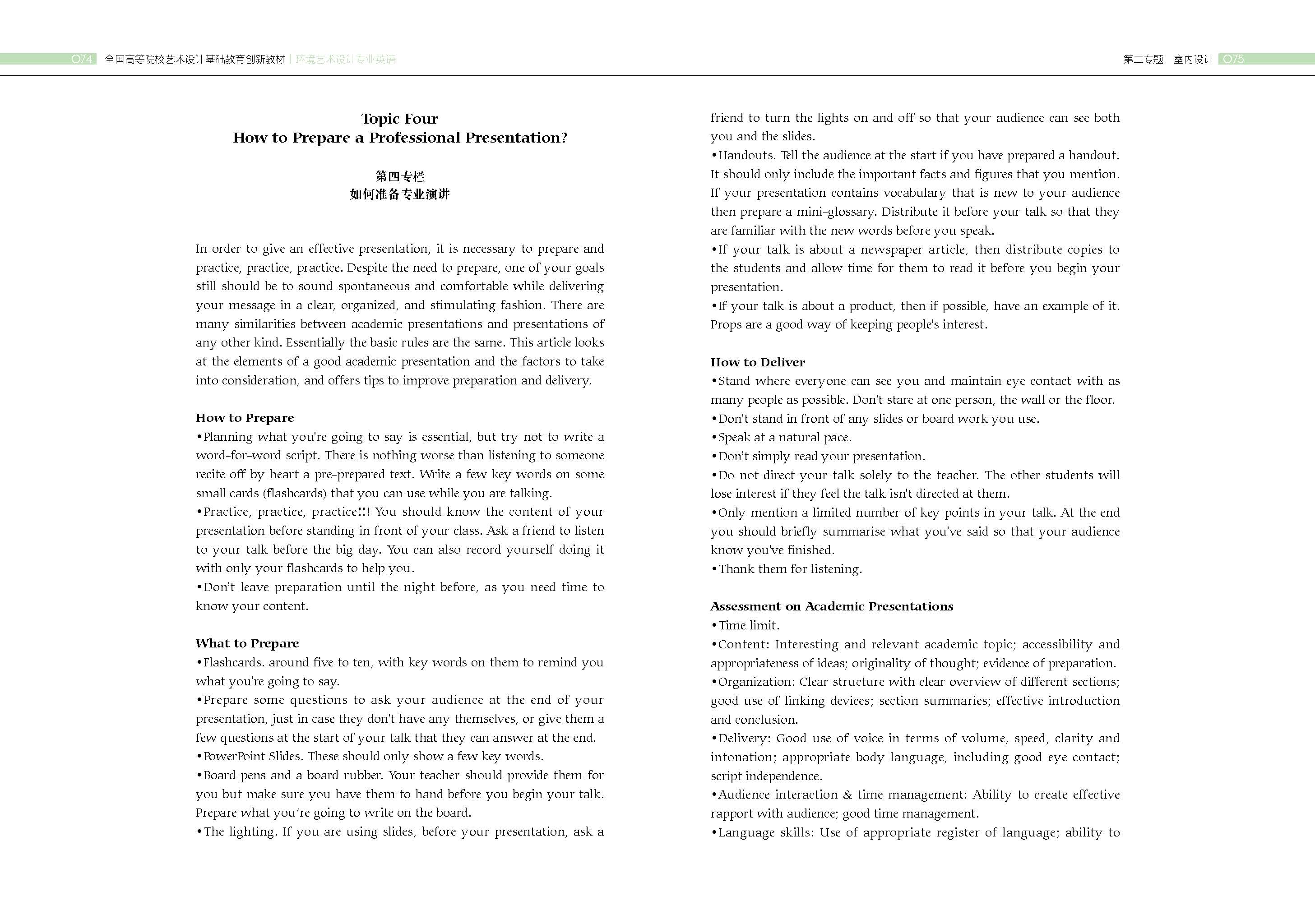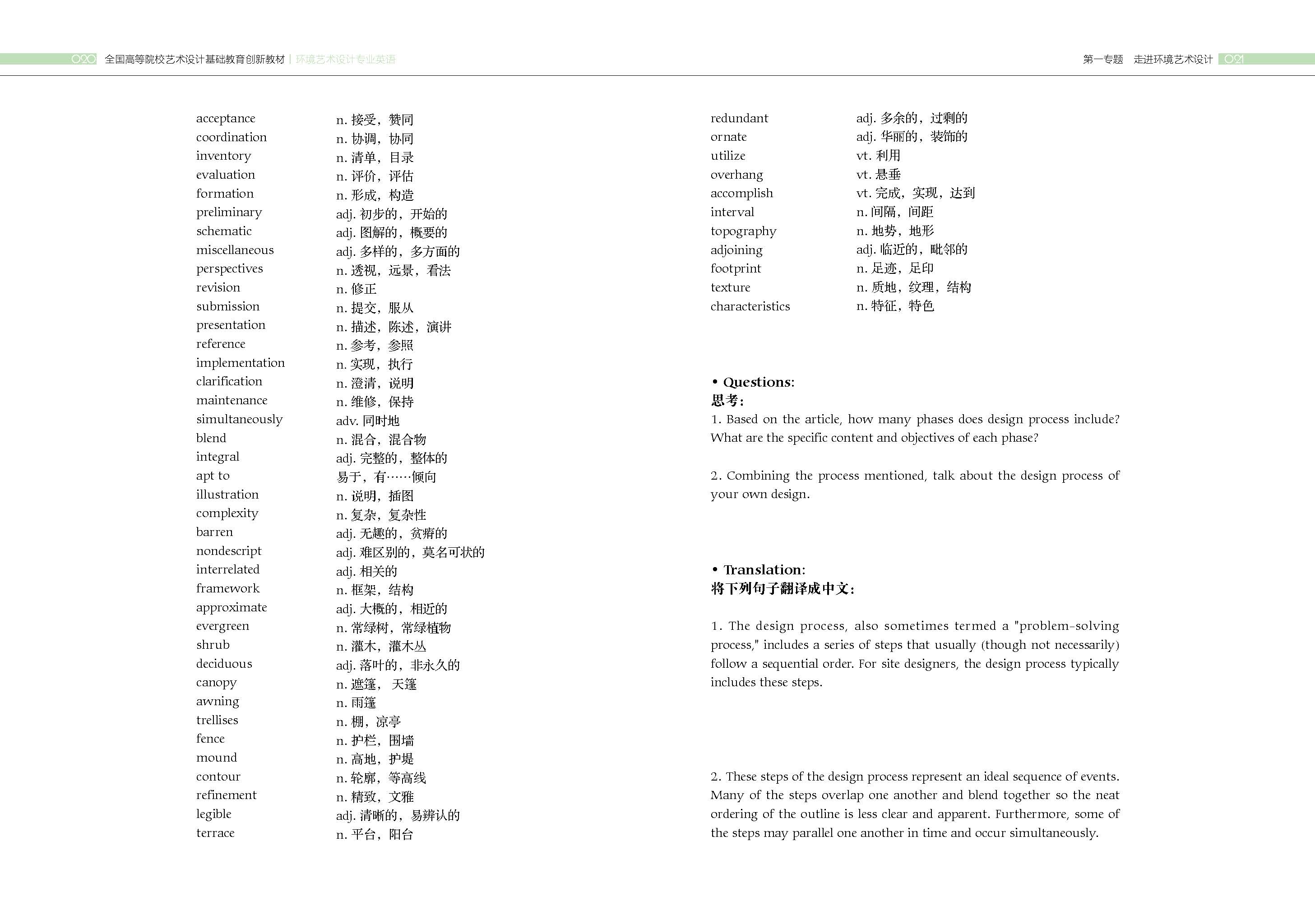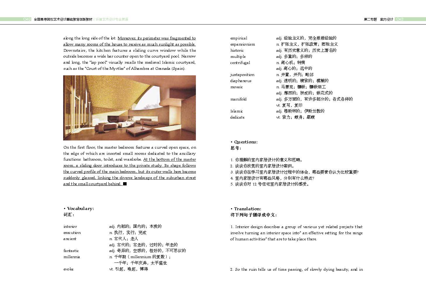 教材內(nèi)容主要分為專業(yè)文獻(xiàn)和課后專欄兩個(gè)部分。其中專業(yè)文獻(xiàn)部分為走進(jìn)環(huán)境藝術(shù)設(shè)計(jì)、室內(nèi)設(shè)計(jì)、景觀設(shè)計(jì)、建筑設(shè)計(jì)以及其他相關(guān)領(lǐng)域五個(gè)專題,共17個(gè)單元。所列專業(yè)文獻(xiàn)均摘自國內(nèi)外優(yōu)秀案例,圖文并茂,增加了教材的實(shí)踐性、可讀性和趣味性。課后對文章中的涉及的專業(yè)詞匯了做出了注解,將穩(wěn)中重點(diǎn)句子以英譯漢的形式讓學(xué)生進(jìn)行鞏固理解,并針對文章內(nèi)容提出思考題,以便讓學(xué)生用英文以分組討論的方式進(jìn)行交流溝通,既在專業(yè)層面提高學(xué)生的英文應(yīng)用能力,又通過練習(xí)培養(yǎng)學(xué)生的英文思維能力。