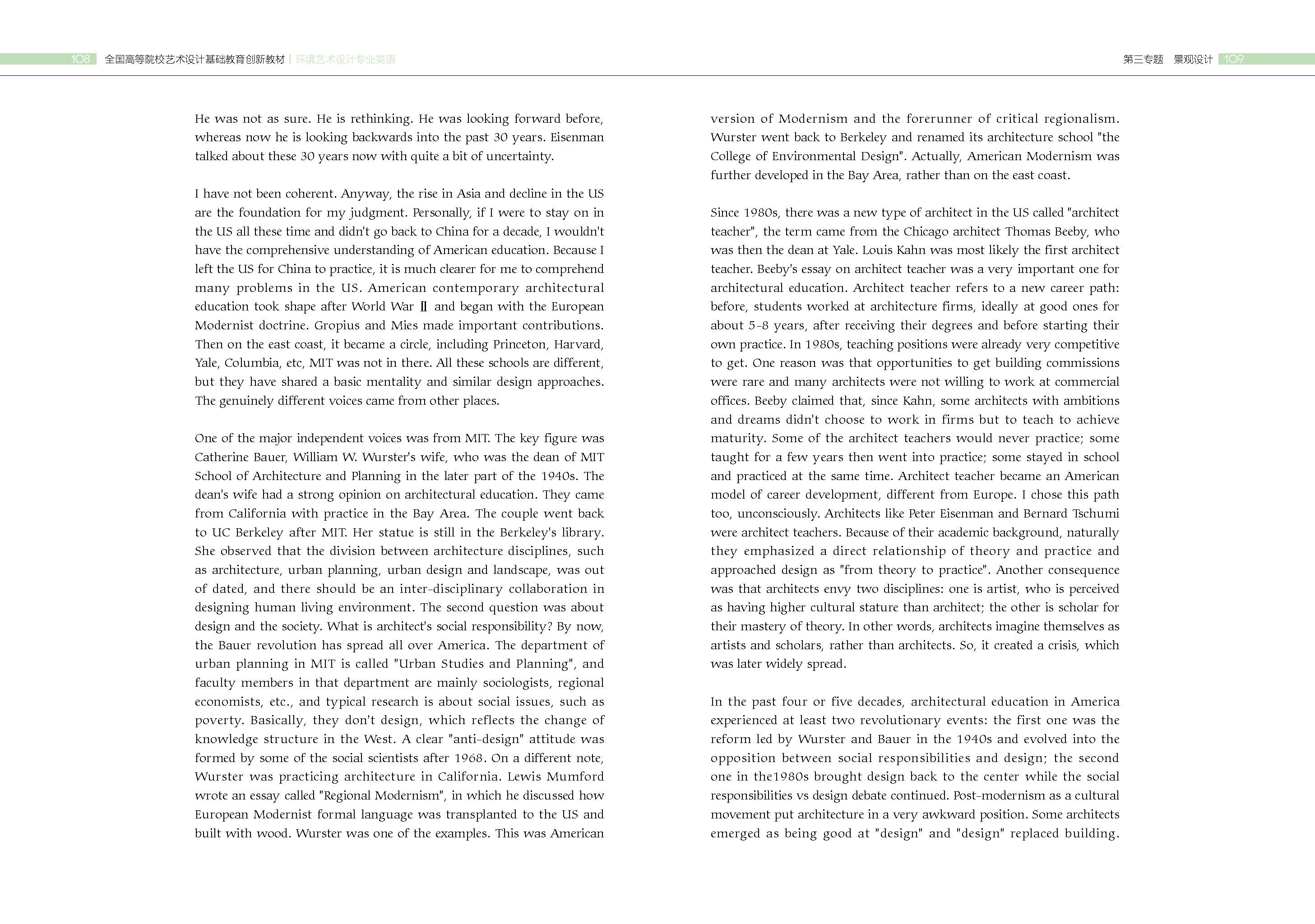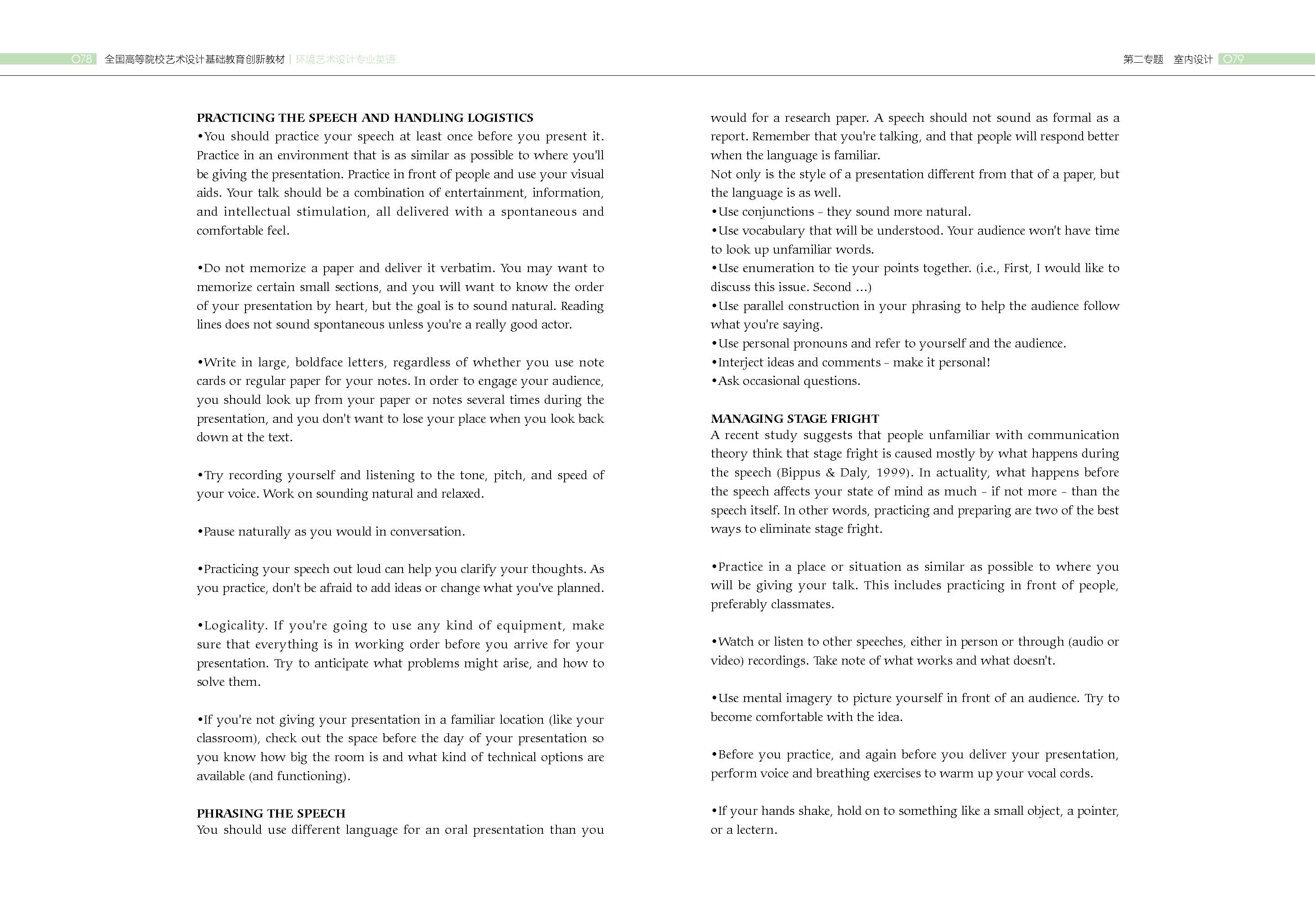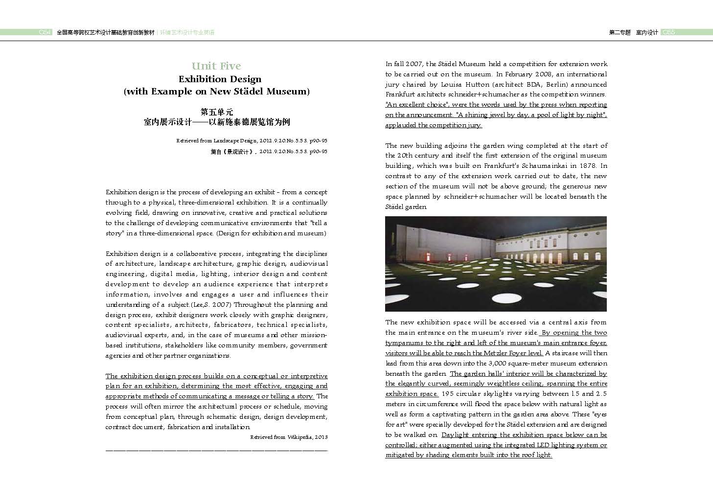 教材內(nèi)容主要分為專業(yè)文獻(xiàn)和課后專欄兩個(gè)部分。其中專業(yè)文獻(xiàn)部分為走進(jìn)環(huán)境藝術(shù)設(shè)計(jì)、室內(nèi)設(shè)計(jì)、景觀設(shè)計(jì)、建筑設(shè)計(jì)以及其他相關(guān)領(lǐng)域五個(gè)專題,共17個(gè)單元。所列專業(yè)文獻(xiàn)均摘自國內(nèi)外優(yōu)秀案例,圖文并茂,增加了教材的實(shí)踐性、可讀性和趣味性。課后對文章中的涉及的專業(yè)詞匯了做出了注解,將穩(wěn)中重點(diǎn)句子以英譯漢的形式讓學(xué)生進(jìn)行鞏固理解,并針對文章內(nèi)容提出思考題,以便讓學(xué)生用英文以分組討論的方式進(jìn)行交流溝通,既在專業(yè)層面提高學(xué)生的英文應(yīng)用能力,又通過練習(xí)培養(yǎng)學(xué)生的英文思維能力。