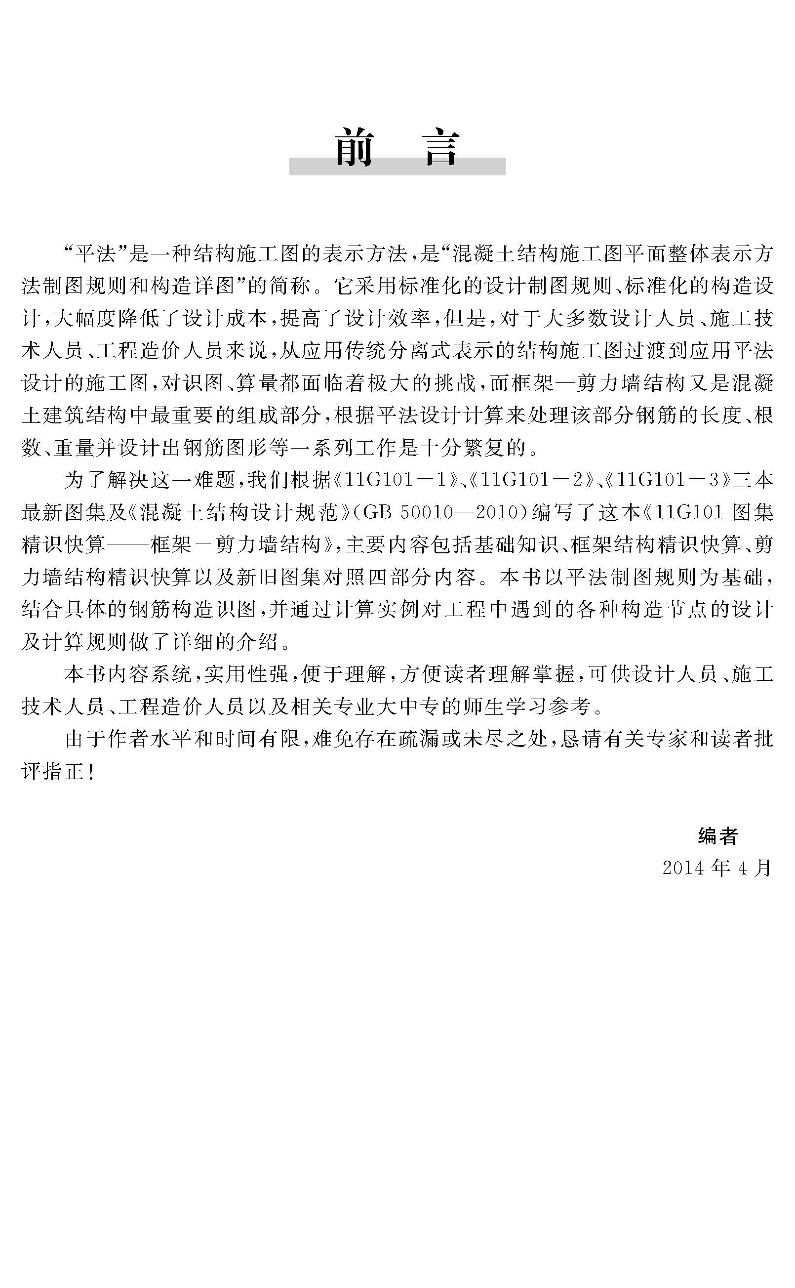本書以《11G101-1》、《11G101-2》、《11G101-3》三本最新圖集及《混凝土結構設計規(guī)范》(GB 50010-2010)為主要理論依據(jù),主要內(nèi)容包括基礎知識、鋼筋精 識快算基礎知識、獨立基礎精識快算、條形基礎精識快算、筏形基礎精識快算以及 新舊圖集對照六大部分內(nèi)容,以平法制圖規(guī)則為基礎,結合具體的鋼筋構造識圖, 通過計算實例詳細講解了獨立基礎、條形基礎、筏形基礎構件的各類鋼筋在實際工 程中的計算要點。