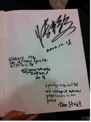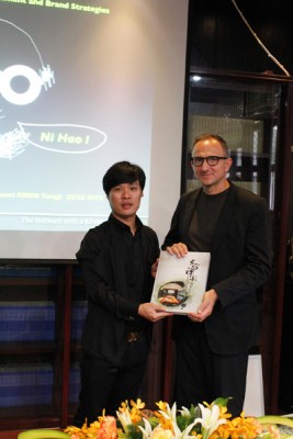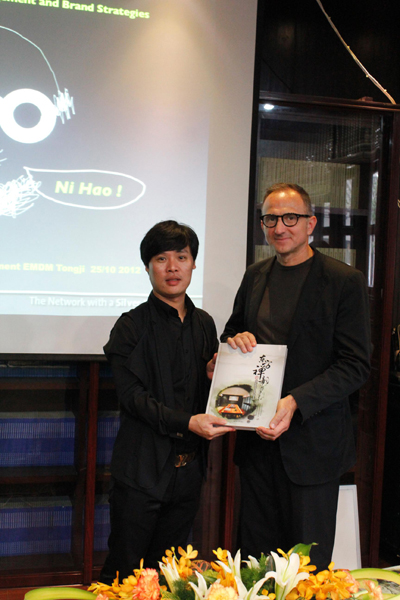 10月25日杭州胡雪巖故居?xùn)|門院,舉辦的“意路向東”設(shè)計(jì)中國行奢想論壇,來自意大利的設(shè)計(jì)大師Giancarlo Tintori和國際銀線聯(lián)盟主席瑞典設(shè)計(jì)大師Jan Sta?l von Holstein以及中國設(shè)計(jì)名家張豐義老師為《東方禪韻》簽名并寄語,三位老師欣然接受主編嚴(yán)建中先生的贈(zèng)書。