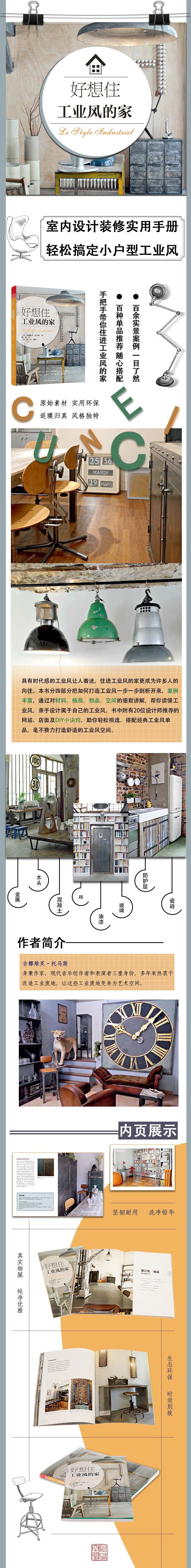 本書是針對工業(yè)風室內設計和裝修的實用手冊,把如何打造工業(yè)風一步一步剖析開來,讓讀者讀懂工業(yè)風,會做工業(yè)風。第一章“材料”,細致介紹了各類經典建材在工業(yè)風格中的使用方法,讓非專業(yè)人士一看就懂;第二章“格局”,向讀者剖析實用的空間搭建技巧,在材料使用的基礎上打造心儀的空間;第三章“物品”,手把手教讀者如何淘到、改造小物件,讓它在工業(yè)風空間中發(fā)揮效用,省錢又環(huán)保;第四章“空間”,在宏觀上把前三章連貫起來,讓不同的空間組成真正的家。書后還附有20位經典設計師名單、工業(yè)風必備特色單品和推薦的廠商與網絡商店,可以讓讀者在學習了解工業(yè)風風格的時候,還可以通過上百家實用網站中購買到自己喜愛的單品。