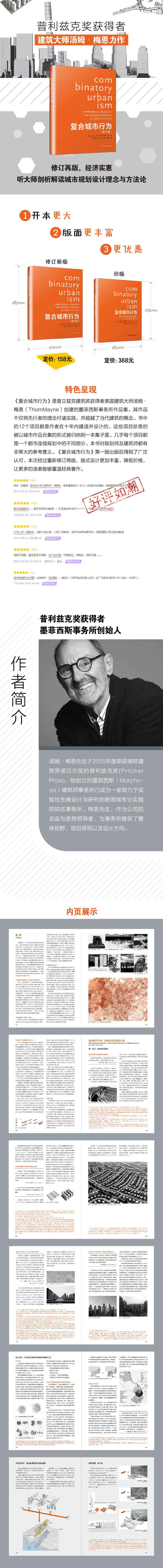 《復(fù)合城市行為》是普立茲克建筑獎(jiǎng)獲得者美國建筑大師湯姆·梅恩(ThomMayne)創(chuàng)建的墨菲西斯事務(wù)所作品集。其作品不僅將先行者的理念付諸實(shí)踐,并超越了當(dāng)代建筑的概念。書中的12個(gè)項(xiàng)目都是作者在十年內(nèi)建造并設(shè)計(jì)的。這些項(xiàng)目珍貴的被以城市作品合集的形式被歸納到一本集子里。幾乎每個(gè)項(xiàng)目都是—個(gè)都市連續(xù)規(guī)劃中的不同部分。本書對(duì)規(guī)劃師及建筑師都有非常大的參考意義。《復(fù)合城市行為》第一版出版后得到了廣泛認(rèn)可,本次經(jīng)過重新修訂再版,版式設(shè)計(jì)更加豐富,降低價(jià)格,讓更多的讀者能夠重溫經(jīng)典著作。