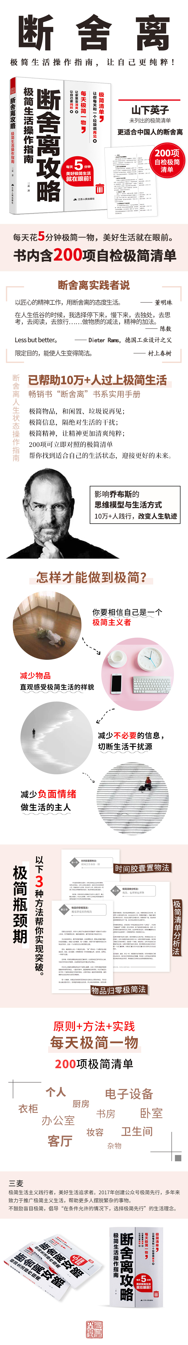 來看看這本書吧,它用最簡單的方法讓你了解極簡主義和極簡生活,將極簡分為物品、信息、精神、個(gè)人等幾個(gè)方面,可以幫你步步為營地開展極簡生活。用書中介紹的極簡方法開展極簡生活,更容易得到自己想要的生活方式,并養(yǎng)成終身受益的習(xí)慣。書中最后的極簡清單,直觀地告訴你哪些舊物可以舍棄,你只需每天花5分鐘看一眼它,按照列表清理多余的物品,每天和一個(gè)垃圾說再見,就可以過上極簡舒適的生活!極簡生活,就是這么簡單!
