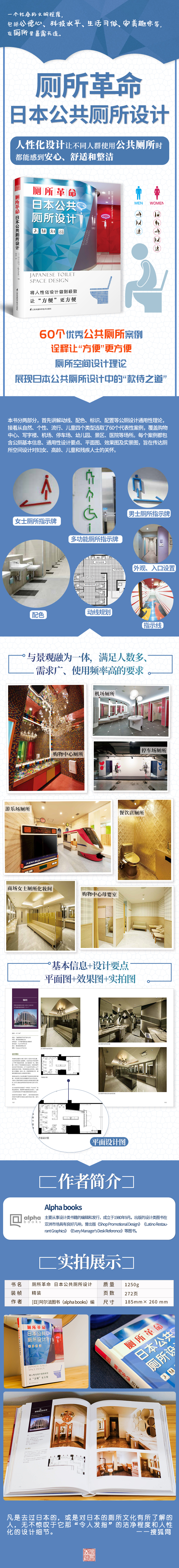 本書共分為兩部分:第一部分,講述動線、配色、標識、配置等公廁設(shè)計通用性理論;第二部分,從自然、個性、流行及兒童四個方面選取了60個代表性的案例。每個案例都包含公廁基本信息、通用性設(shè)計要點、平面圖、效果圖及實景圖。旨在傳達廁所空間設(shè)計時對外國人、婦女、高齡、兒童和殘疾人士的關(guān)懷,讓廁所空間設(shè)計更人性化、更精細化。