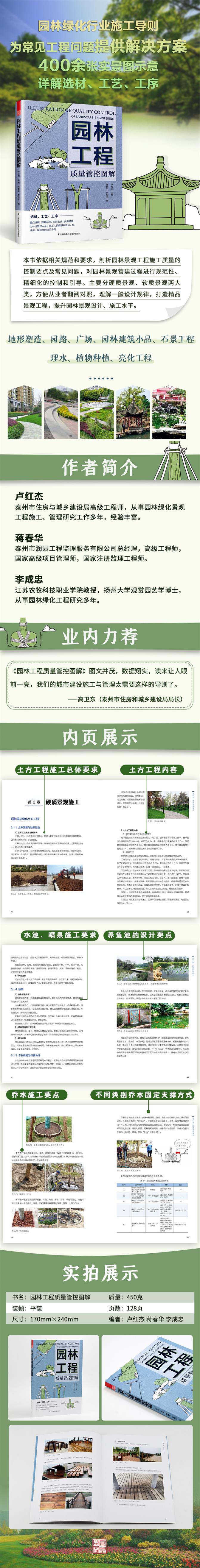 本書(shū)充分運(yùn)用實(shí)踐中的案例圖片,從選材、施工工藝、工序等方面,依據(jù)相關(guān)規(guī)范和要求,從感觀效果上剖析園林景觀工程施工質(zhì)量的控制要點(diǎn)及常見(jiàn)問(wèn)題。以硬質(zhì)景觀、軟質(zhì)景觀作為園林工程的兩大分類,逐一剖析各項(xiàng)施工的設(shè)計(jì)和施工質(zhì)量要求,展示常見(jiàn)工程問(wèn)題,方便相關(guān)從業(yè)人員在工程進(jìn)行過(guò)程中隨時(shí)翻閱對(duì)照。