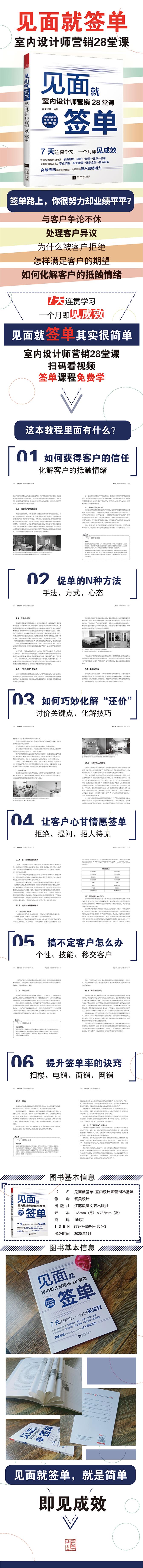 簽單,是每個(gè)設(shè)計(jì)、裝修行業(yè)從業(yè)者最重視的環(huán)節(jié),但一個(gè)簡(jiǎn)單的詞語(yǔ)后面,是諸多細(xì)節(jié)和實(shí)力的體現(xiàn),設(shè)計(jì)師要具有的技能、各環(huán)節(jié)要注意的細(xì)節(jié)、與客戶(hù)交流溝通的技巧、合作結(jié)束后關(guān)系的維護(hù)等等,都是影響能否簽單的關(guān)鍵因素。本書(shū)總結(jié)了影響簽單的28個(gè)關(guān)鍵點(diǎn),詳細(xì)介紹了每個(gè)關(guān)鍵點(diǎn)設(shè)計(jì)師應(yīng)該如何做才能促成簽單。每一步都簡(jiǎn)單易懂,操作性強(qiáng),是家裝行業(yè)新人進(jìn)階不可或缺的指導(dǎo)手冊(cè)。