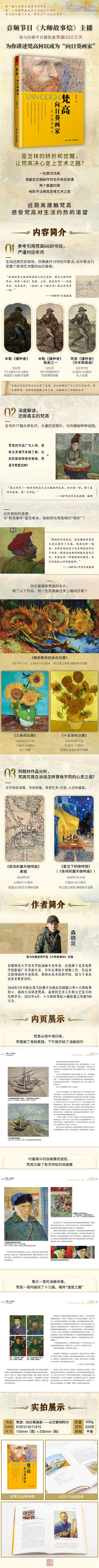 本書作者森曉炅自2018年3月開播音頻節(jié)目《大師故事燴》,獲得了聽眾的廣泛好評(píng)。2019年,森曉炅決定重寫梵高,盡可能真實(shí)還原這位苦難藝術(shù)家。大量書信和傳記作品、數(shù)不盡的藝術(shù)史名作、眾說紛紜的歷史懸案……這位落魄傳奇的畫家和那個(gè)激情燃燒的年代,伴隨了作者將近1000個(gè)日夜。梵高一生顛沛流離,在20多個(gè)地方生活過,本書聚焦他短暫生命中的兩個(gè)重要時(shí)期——巴黎、阿爾——從1886年2月28日到1889年5月8日。這三年中,梵高經(jīng)歷了轉(zhuǎn)折和覺醒,走上了藝術(shù)之路。